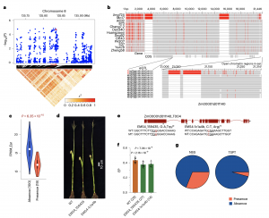 eQTL分析還檢測到兩個近端eQTL,分別與Zm00001d006055和Zm00001d011140的表達(dá)水平相關(guān) (圖4a和5a)。Zm00001d006055的同源基因調(diào)控花的形態(tài)發(fā)生,Zm00001d011140的同源基因在調(diào)節(jié)植物發(fā)育中發(fā)揮重要作用。350個溫帶ILs的基因分型顯示,Zm00001d006055(圖4a-4c)的6 bp InDels和Zm00001d011140(圖5a-5c)的92 bp SVs位于已報道的染色體開放區(qū)域(OCRs),與各自的表達(dá)變異顯著相關(guān)。此外,田間試驗(yàn)表明,與野生型相比,功能缺失突變體Zm00001d006055(圖4d-4f)和Zm00001d011140(圖5d- 5f)較其野生型材料分別表現(xiàn)為雄穗分枝顯著減少和穗位高顯著降低的表型。上述結(jié)果表明,Zm00001d006055和Zm00001d011140分別對雄穗分枝數(shù)和穗位高有正向調(diào)控作用。等位基因頻率分析顯示,PA品系中含有6 bp InDel的單倍型的頻率(21.1%)遠(yuǎn)高于TSPT品系(4.3%),NSS品系中含有92 bp的單倍型的頻率(31.1%)遠(yuǎn)高于TSPT品系(4.3%)(圖4g和5g),可能是這些亞群間對應(yīng)性狀分化的重要原因。