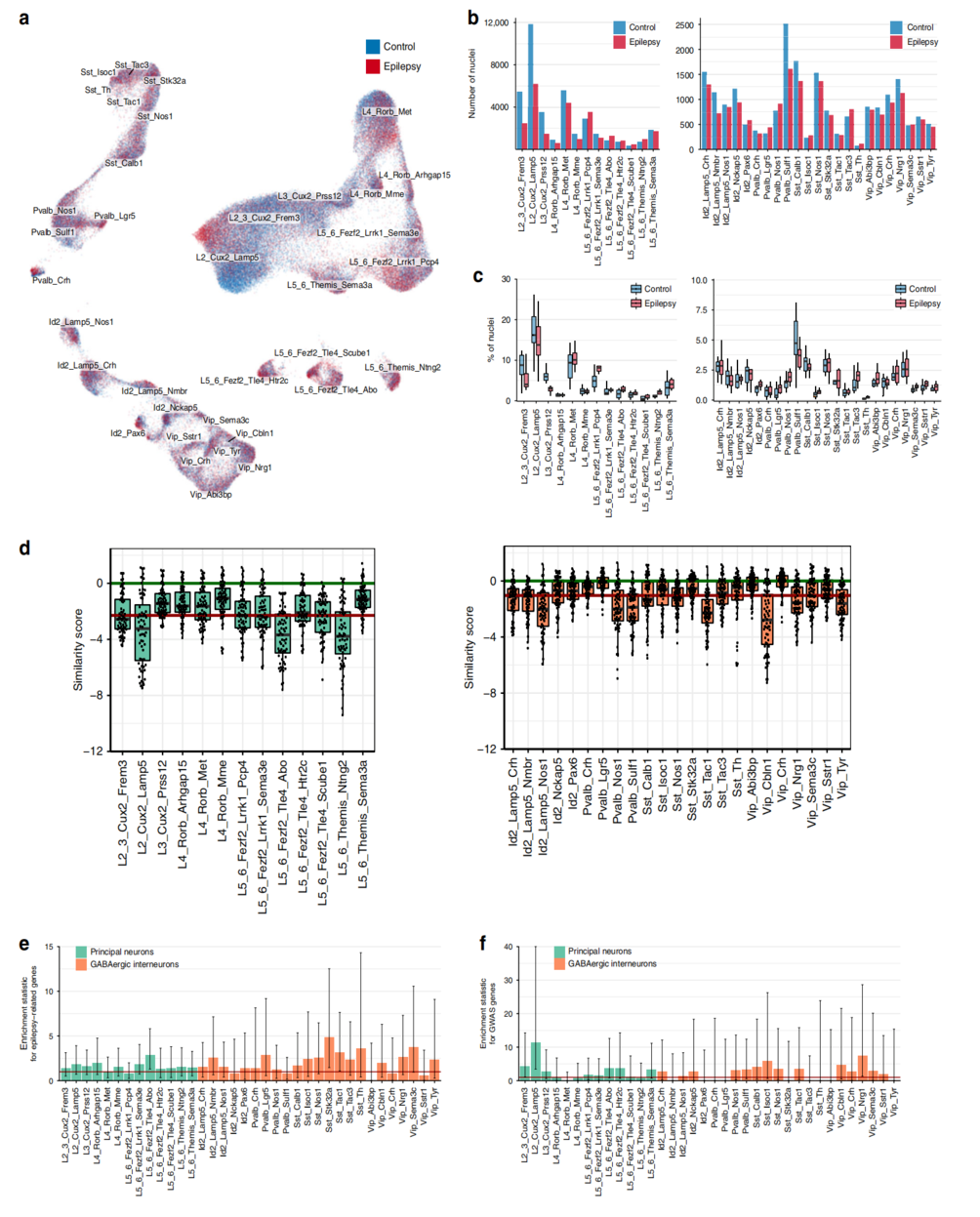 通過(guò)基因表達(dá)相關(guān)性分析,發(fā)現(xiàn)癲癇和非癲癇神經(jīng)亞型之間的巨大差異(圖1d),這可能表明癲癇對(duì)其轉(zhuǎn)錄組有特定的影響。對(duì)于主要神經(jīng)元,L5-6_Fezf2_Tle4_Abo、L5-6_Themis_Ntng2、L2_