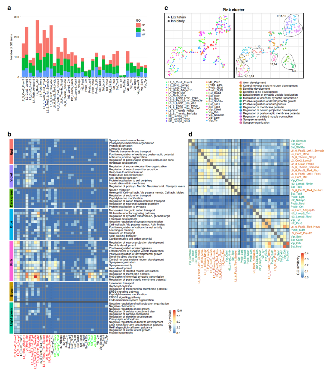 作者計(jì)算了每種已鑒定亞型GO中DE基因的富集程度,一些神經(jīng)元亞型在癲癇中表現(xiàn)出了大的轉(zhuǎn)錄組改變(>100豐富的GO),但多數(shù)神經(jīng)元亞型中只有少數(shù)GO,特別是對(duì)于生物過(guò)程(BP)來(lái)說(shuō),這應(yīng)該與通路的生物學(xué)功能相關(guān)(圖2a)。這些受影響較小的亞型中,大多數(shù)在癲癇細(xì)胞和非癲癇細(xì)胞之間也具有高的基因表達(dá)相關(guān)性(圖1d),從而證實(shí)癲癇和非癲癇之間轉(zhuǎn)錄組相關(guān)性高的亞型中,癲癇改變的信號(hào)通路也較少。