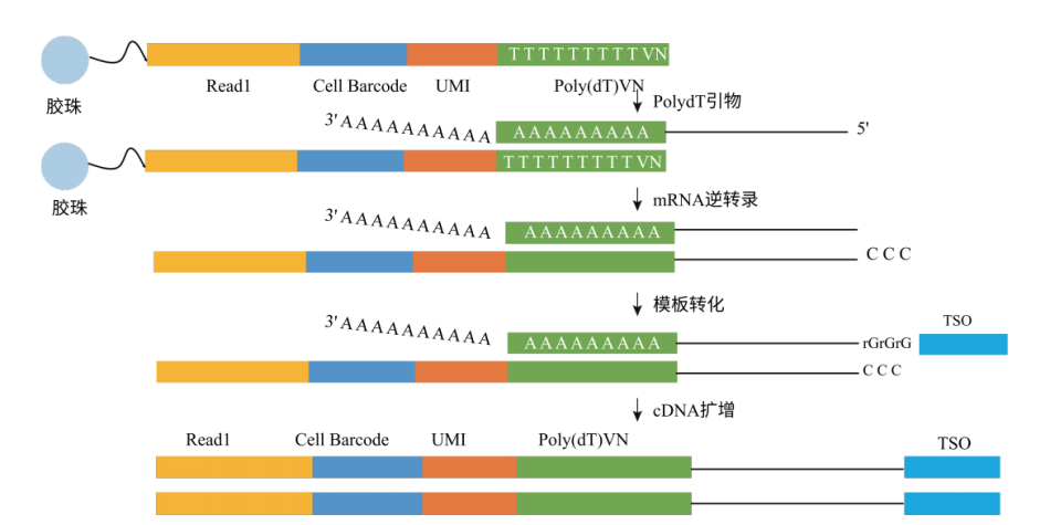 GEMs形成后,細胞裂解釋放出mRNA;同時膠珠也會自動溶解,釋放出大量含有Barcode序列的引物,并利用引物末端的Ploy(dT)VN序列捕獲液滴中的mRNA,并在一個個GEM中獨立完成mRNA逆轉錄,產生帶有Barcode和UMI信息的cDNA。隨后“油包水”結構裂開,進行cDNA擴增。