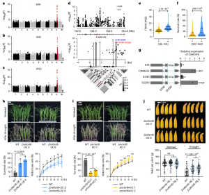 研究發(fā)現(xiàn),位于ZmABF4基因第二內(nèi)含子的SNP (S1474)和SV (S3205, 42 bp)與該基因的表達(dá)和苗期抗旱性密切相關(guān)。ZmABF4編碼bZIP轉(zhuǎn)錄因子,為ABA和干旱誘導(dǎo)表達(dá)的主要調(diào)節(jié)因子。攜帶ZmABF4CIMBL55等位基因的種質(zhì)在基因表達(dá)和抗旱性方面明顯高于攜帶ZmABF4B73等位基因的種質(zhì)(圖3d, e)。轉(zhuǎn)基因過表達(dá)分析發(fā)現(xiàn),與野生型(WT)相比,ZmABF4轉(zhuǎn)基因株系在干旱脅迫下存活率顯著提高,葉片失水率降低(圖3f-h)。說明ZmABF4對(duì)玉米抗旱性具有正向調(diào)控作用,?ZmABF4CIMBL55可能是玉米抗旱性的優(yōu)異等位基因。