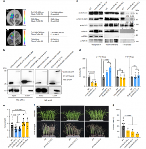 為了解ZmRtn16的生物學(xué)功能,亞細(xì)胞定位分析發(fā)現(xiàn)ER標(biāo)志物與ZmRtn16-GFP融合蛋白共定位在ER中,表明ZmRtn16-GFP在ER中發(fā)揮作用。免疫共沉淀(co-IP)顯示ZmRtn16能與液泡膜H+-ATPase復(fù)合體A (ZmVHA-A)和E3亞基?(ZmVHA-E3)相互作用。隨后,通過比較zmrtn16-crispr和WT株系的ZmVHA-A和ZmVHA-E3亞細(xì)胞定位,發(fā)現(xiàn)ZmRtn16可以促進(jìn)ZmVHA-A和ZmVHA-E3的液泡膜定位(圖6c)。此外,與WT植物相比,ZmRtn16-OE株系液泡質(zhì)子泵活性較高,而ZmRtn16-KO株系液泡質(zhì)子泵活性較低(圖6e),突出了液泡質(zhì)子泵在抗旱性上的作用。綜上所述, CIMBL55基因組中ZmRtn16基因3′ -UTR中28 bp缺失,可能增強(qiáng)ZmRtn16的表達(dá),促進(jìn)了ZmVHA-A和ZmVHA-E3在液泡膜中的定位,從而提高玉米的抗旱性。