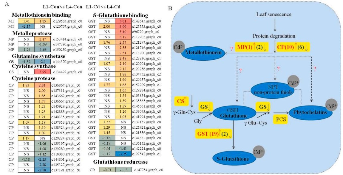 MT(金屬硫蛋白)是一組金屬結(jié)合蛋白,在金屬分配和穩(wěn)態(tài)中起著關(guān)鍵作用。1個上調(diào)基因(c129583.Graph_c0)和一個下調(diào)基因(c120767.graph_c0)編碼MT。Cd脅迫使上調(diào)基因的差異倍數(shù)比對照增加了23.8%,并完全抑制了表達(dá)下調(diào)的基因。結(jié)合Cd脅迫下MT含量的增加,作者的研究結(jié)果表明,MT-Cd結(jié)合可能在幼葉(L1)和衰老葉片(L4)的Cd解毒過程中發(fā)揮作用。半胱氨酸蛋白酶(CPs)是葉片衰老過程中負(fù)責(zé)蛋白水解活性的最豐富的酶。在該轉(zhuǎn)錄組中鑒定出17個編碼CP的基因。在對照組中,只有4個基因的表達(dá)有顯著差異。Cd脅迫顯著促進(jìn)CP表達(dá),有10個上調(diào)基因在Cd處理組的差異倍數(shù)高于處理組,Cd處理組的6個基因下調(diào)倍數(shù)低于對照組。然而,PC的蛋白水解活性是否與衰老葉片中Cd的積累有關(guān)尚不清楚。