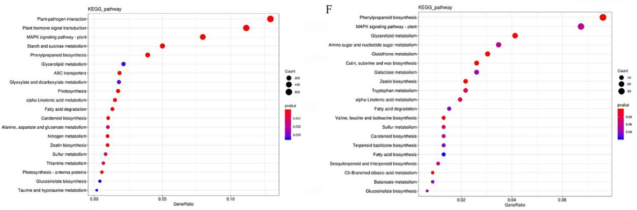 圖2:A-D:RvsS的DEGs在生物過程、細(xì)胞成分和分子功能中的GO富集圖;E-H:R與S的DEGsKEGG富集點圖(注:A:RCKvsRCa;B:RCavsSCa;C:SCKvsSCa;D:RCKvsRCavsSCKvsSCa中R特異性表達(dá)的DEGs;E:RCKvsRCa;F:RCavsSCa;G:SCKvsSCa;H:R-RCKvsRCavsSCKvsSCa中特異表達(dá)的DEG。)