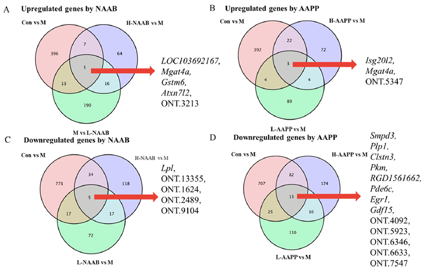 韋恩圖表明了不同分組之間上調(diào)和下調(diào)的DEG的交集,揭示了受NAAB和AAPP影響的特定基因(圖2A?D)。Gstm6與谷胱甘肽代謝、藥物代謝以及細(xì)胞色素P450對外源物質(zhì)的代謝有關(guān),在胰島素抵抗和糖尿病小鼠中均被報道下調(diào),并可能參與T2D的進展。L-NAAB和H-NAAB均能恢復(fù)Gstm6的表達(dá)。與ND組和Con組相比,M組中有一個共同的基因被兩種花色苷提取物(NAAB和AAPP)上調(diào),即編碼N-乙酰氨基葡萄糖轉(zhuǎn)移酶GnT-4a的Mgat4a。在小鼠中,Mgat4a基因的遺傳失活導(dǎo)致葡萄糖轉(zhuǎn)運蛋白2N-聚糖的錯誤組裝,導(dǎo)致葡萄糖轉(zhuǎn)運蛋白2和質(zhì)膜凝集素Galectin 9之間的相互作用失敗,導(dǎo)致葡萄糖轉(zhuǎn)運蛋白2內(nèi)化,從而抑制葡萄糖攝取和葡萄糖刺激的胰島素分泌。還發(fā)現(xiàn)高脂飲食抑制了Mgat4a的表達(dá)。藍(lán)莓的非?;ㄉ蘸妥仙R鈴薯的?;ㄇ嘬斩际侨绱?。編碼脂蛋白脂肪酶的LPL在小鼠肝臟中過表達(dá),導(dǎo)致肝臟甘油三酯含量增加2倍,并導(dǎo)致胰島素抵抗,部分原因是對胰島素的反應(yīng)受損,抑制內(nèi)源性葡萄糖的產(chǎn)生。在本研究中,L-NAAB和H-NAAB都下調(diào)了ZDF大鼠高水平的LPL,這可能導(dǎo)致胰島素敏感性的改善。早期生長反應(yīng)基因-1(Egr1)可被胰高血糖素短暫激活,介導(dǎo)胰高血糖素調(diào)節(jié)的糖異生。AAPP降低Egr1,這可能與糖異生減少有關(guān)。