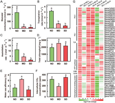 樣品做了三組處理:干旱處理0天(ND stress)、5天(MD stress)和10天(SD stress),并對(duì)光合作用進(jìn)行了檢測(cè),同時(shí)檢測(cè)了脫落酸(ABA)和生長(zhǎng)素(auxin)的含量。