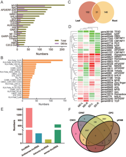 干旱脅迫顯著改變了玫瑰葉片和根中與DEGs相關(guān)的279個(gè)轉(zhuǎn)錄因子的表達(dá)。MD和SD條件下,MYB、bHLH、b-ZIP、NF-Y、WRKY和AP2家族的TFs顯著富集,其中MYB、AP2和WRKY占主導(dǎo),差異表達(dá)的TFs分別為124、46和27個(gè)(圖5A)。bHLH和WRKY家族對(duì)干旱脅迫的響應(yīng)非常相似。在MD-L處理中,有少量的DEGs、上調(diào)基因,但有大量的下調(diào)基因。相比之下,SD-L處理在這些基因家族中導(dǎo)致了更多的上調(diào)基因,并且適應(yīng)干旱后的葉片和根的干旱響應(yīng)的倍數(shù)變化通常低于SD處理。如圖5C所示,在干旱脅迫下,葉片和根中分別有133和177個(gè)TF基因差異表達(dá)(圖5 C),其中31個(gè)基因是兩個(gè)器官共有的且表達(dá)模式相似。例如,gene 6966和49627在MD和SD條件下,在葉片和根中都是表達(dá)上調(diào)。一些蛋白激酶家族,包括RLK/Pelle_DLSV(142個(gè)成員,玫瑰轉(zhuǎn)錄組中較大的家族)和RLK/Pelle_ RLCK -VIIa -2(101個(gè)成員)(圖5 B),在玫瑰轉(zhuǎn)錄組中負(fù)責(zé)蛋白激酶的大小。
