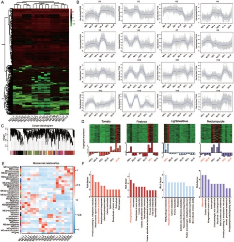 接下來(lái),根據(jù)RNA-seq數(shù)據(jù)鑒定了7101個(gè)DEGs,占本研究鑒定的所有基因的14.63% (7,101/48,549)。這些DEGs的熱圖表現(xiàn)出兩個(gè)保守組,如在干旱脅迫下誘導(dǎo)和抑制根和葉的表達(dá)模式(圖6 A)。然后使用K-means算法進(jìn)行富集分析,得到16個(gè)聚類(K1-K16)(圖6 B)。在SD條件下,K12、K13和K16基因主要在葉片和根中表達(dá),表明它們可能參與干旱脅迫。而在MD和SD處理下,K4、K5、K7、K9和K11基因在根和葉中均受到抑制。