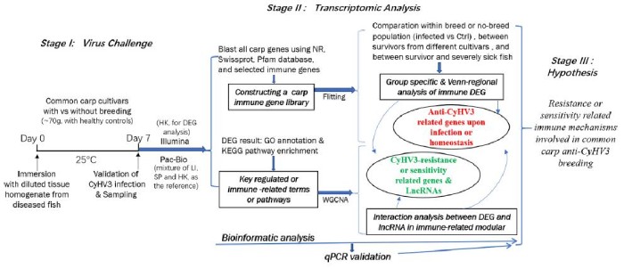 鯉魚(yú)皰疹病毒-3(CyHV-3)感染是鯉魚(yú)養(yǎng)殖的主要威脅,可導(dǎo)致鯉魚(yú)大量的死亡。CyHV-3可通過(guò)削弱宿主的免疫系統(tǒng)而使其死亡,導(dǎo)致其對(duì)病原微生物易感性,并可能在感染后6至10天內(nèi)出現(xiàn)發(fā)病和死亡。感染CyHV-3后存活下來(lái)的鯉魚(yú)可以抵抗這種病毒未來(lái)的感染。由于CyHV-3在鯉魚(yú)中存在潛伏期和持續(xù)性攜帶期,遺傳背景對(duì)于了解對(duì)病毒的耐藥性至關(guān)重要。德國(guó)鏡鯉品系G4是中國(guó)廣泛栽培的鯉魚(yú)品系,但因CyHV-3病毒引起高死亡率。然而目前在研究抗CyHV-3免疫機(jī)制的詳細(xì)免疫系統(tǒng)網(wǎng)絡(luò)方面,還缺乏系統(tǒng)的研究。最近的研究表明,lncRNAs在不同類(lèi)型病原體感染時(shí)的廣泛差異表達(dá),表明lncRNAs在魚(yú)類(lèi)免疫反應(yīng)中起著關(guān)鍵作用。然而,在CyHV-3感染期間,鯉魚(yú)體內(nèi)的特異性LncRNA對(duì)免疫反應(yīng)的調(diào)節(jié)尚未被研究。第三代測(cè)序(如PacBio)可以解碼比第二代測(cè)序方法(如Illumina)更長(zhǎng)的基因序列,包括mRNA和非編碼RNA在內(nèi)的更高質(zhì)量的轉(zhuǎn)錄本組裝,可能提供對(duì)遺傳抗性機(jī)制的更詳細(xì)理解。在本研究中,為了揭示鯉魚(yú)抗CyHV3育種中涉及的免疫機(jī)制,使用圖1所示的策略,對(duì)CyHV-3激發(fā)期間的mRNA和長(zhǎng)非編碼RNA(lncRNA)進(jìn)行了整合轉(zhuǎn)錄組學(xué)分析。對(duì)來(lái)自繁殖品系或非繁殖品系的存活鯉魚(yú)和健康對(duì)照鯉魚(yú)的免疫相關(guān)轉(zhuǎn)錄本進(jìn)行了分析。