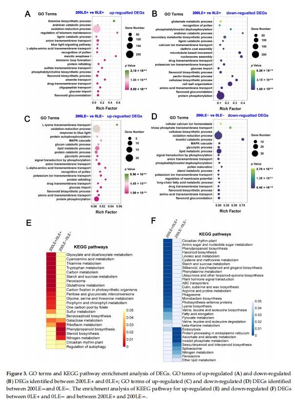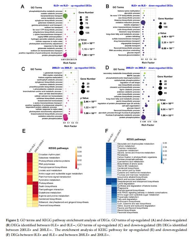 E.gansuensis上調(diào)1269個基因,下調(diào)1195個0LE+基因(葉E+植物在0mMNaCl下)與0LE-(E-植物在0mMNaCl下的葉子)相比。類似地,E.gansuensis誘導(dǎo)844個基因并抑制200LE+(E+植物的葉子)的973個基因在200mMNaCl下)與200LE-(E-植物的葉子在200mMNaCl下)相比(圖1)。目前的結(jié)果表明在NaCl脅迫下E.gansuensis對基因的調(diào)控有巨大的影響與200mMNaCl相比。對0LE+和0LE-之間的DEGs進(jìn)行GO富集分析發(fā)現(xiàn),E.gansuensis主要誘導(dǎo)“鈉離子跨膜轉(zhuǎn)運(yùn)”、“胚胎后發(fā)育的正調(diào)控”、“蛋白質(zhì)磷酸化”、“光系統(tǒng)化學(xué)計(jì)量調(diào)整”和“谷氨酸代謝過程”(圖2A)。此外,GO富集分析表明,類別“類黃酮葡萄糖醛酸化”、“類黃酮生物合成過程”、“氧化-還原”過程”和“陰離子跨膜轉(zhuǎn)運(yùn)”在下調(diào)中富集E.gansuensis在0mMNaCl濃度下的DEGs(圖2B)。這些結(jié)果暗示E.gansuensis重新編排了植物生理學(xué)和重要生物學(xué)的許多方面提高寄主植物的競爭力。GO富集分析在200LE+和200LE?之間的DEGs表明,E.gansuensis主要誘導(dǎo)“蛋白質(zhì)磷酸化”、“氧化還原過程”、“油菜素類固醇生物合成過程”、“細(xì)胞鈣離子穩(wěn)態(tài)”和“L-谷氨酸轉(zhuǎn)運(yùn)”(圖2C);此外,GO富集分析發(fā)現(xiàn)“蛋白質(zhì)磷酸化”的類別,“果糖6-磷酸代謝過程”、“類黃酮生物合成過程”和“MAPK”在200mMNaCl濃度下,E.gansuensis在下調(diào)的DEG中富集級聯(lián)”(圖2D)。我們的研究結(jié)果表明,E.gansuensis通過激活細(xì)胞信號轉(zhuǎn)導(dǎo)促進(jìn)宿主在脅迫環(huán)境下的生長,維持平衡。促進(jìn)ROS、Ca2+信號和油菜素類固醇(BR)的生物合成,它們在抗壓過程中起作用。