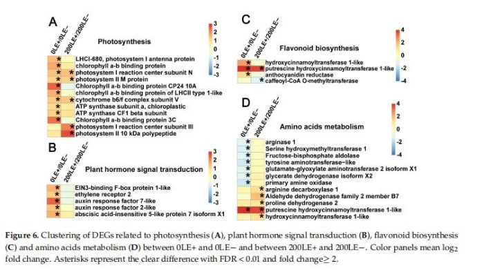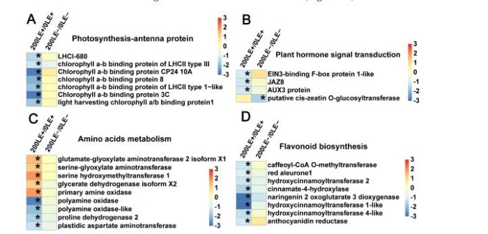 E.gansuensis顯著激活10個基因和5個光合作用基因分別為0mM和200mMNaCl濃度下。E.gansuensis的作用寄主植物的光合作用基因更明顯在0mMNaCl下比200mM氯化鈉(圖6A)。此外,E.gansuensis顯著激活植物的五個信號傳導(dǎo)基因在0mMNaCl濃度下;這些基因包括乙烯信號通路的兩個基因、生長素信號通路的兩個基因和脫落酸信號通路的一種基因。然而,E.gansuensis沒有顯著激活植物激素信號轉(zhuǎn)導(dǎo)基因在200mMNaCl濃度13下(圖6B),這意味著NaCl的影響大于E.gansuensis在植物激素基因表達(dá)方面的研究。E.gansuensis顯著下激活植物激素信號轉(zhuǎn)導(dǎo)基因在0mMNaCl濃度下,但E.gansuensis在200mMNaCl濃度下顯著調(diào)控兩個類黃酮生物合成基因(圖6C)。E.gansuensis顯著抑制氨基的八個基因在0mMNaCl濃度和E.gansuensis的酸代謝顯著激活下激活植物激素信號轉(zhuǎn)導(dǎo)基因在200mMNaCl濃度下的(圖6D)。更遠(yuǎn),E.gansuensis顯著下調(diào)甘氨酸、絲氨酸和蘇氨酸代謝,以及作為色氨酸代謝在0mMNaCl濃度下。E.gansuensis顯著下調(diào)賴氨酸降解,上調(diào)精氨酸和脯氨酸代謝在200mMNaCl下。因此,很可能,E.gansuensis通過調(diào)節(jié)宿主氨基酸代謝來提高A.inebrians的耐鹽性。