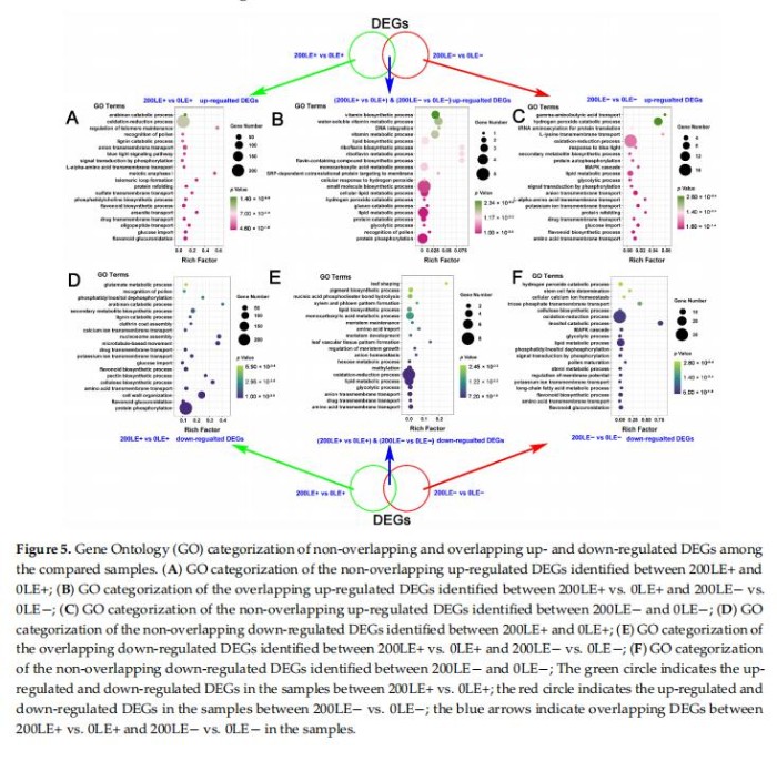 NaCl脅迫僅上調(diào)LE+和LE+之間的2015DEG,且僅NaCl脅迫在LE-和LE-之間上調(diào)139DEG(補(bǔ)充圖S4C)。氯化鈉脅迫僅在LE+和LE+之間下調(diào)4707DEG,NaCl脅迫僅下調(diào)LE-和LE-之間的290DEG(補(bǔ)充圖S4D)。分析結(jié)果這些特殊上調(diào)的DEG在0mMNaCl與200mMNaCl下的GO富集度LE+和LE-分別表明NaCl脅迫主要調(diào)節(jié)氧化還原過程、次生代謝物的生物合成、小分子轉(zhuǎn)運(yùn)和細(xì)胞信號轉(zhuǎn)導(dǎo),主要富集在LE+和LE-中獨(dú)特的上調(diào)DEGs(圖5A,C)。例如“氨基酸跨膜轉(zhuǎn)運(yùn)”、“類黃酮生物合成過程”、“鉀離子跨膜轉(zhuǎn)運(yùn)”、“葡萄糖輸入”、“L-α-氨基酸跨膜轉(zhuǎn)運(yùn)”、“陰離子跨膜轉(zhuǎn)運(yùn)”、“信號轉(zhuǎn)導(dǎo)”A.inebrians的磷酸化”、“MAPK級聯(lián)”、“氧化還原過程”和“過氧化氫分解代謝過程”主要富集于獨(dú)特的上調(diào)氯化鈉脅迫下LE-中的DEGs(圖5C)。次生物質(zhì)的代謝和運(yùn)輸代謝物(“一元10羧酸代謝過程”、“蛋白質(zhì)分解代謝過程”和“脂質(zhì)代謝過程”),ROS信號(“過氧化氫分解代謝過程”和“細(xì)胞對過氧化氫的反應(yīng)”)和A.inbrians的“蛋白質(zhì)磷酸化”主要富集分別在LE+和LE-之間的NaCl脅迫下共享上調(diào)的DEG(圖5B)。類似地,“蛋白質(zhì)磷酸化”、“類黃酮葡萄糖醛酸化”、“類黃酮生物合成過程”、“氨基酸跨膜轉(zhuǎn)運(yùn)”、“鉀離子跨膜”轉(zhuǎn)運(yùn)”、“鈣離子跨膜轉(zhuǎn)運(yùn)”和“谷氨酸代謝過程”A.inebrians主要富集在NaCl下LE+中獨(dú)特的下調(diào)DEGs壓力(圖5D)。次生代謝物的合成和轉(zhuǎn)運(yùn)(“黃酮類葡萄糖醛酸化”、“氨基酸跨膜轉(zhuǎn)運(yùn)”、“類黃酮生物合成過程”和“長鏈脂肪酸代謝過程”)、“鉀離子跨膜轉(zhuǎn)運(yùn)”、“氧化-還原過程”和信號轉(zhuǎn)導(dǎo)途徑(“磷酸化信號轉(zhuǎn)導(dǎo)”A.inebrians的“MAPKcascade”)主要富集于獨(dú)特的下調(diào)氯化鈉脅迫下LE-中的DEGs(圖5F)。次生物質(zhì)的代謝和運(yùn)輸代謝物(“氨基酸跨膜轉(zhuǎn)運(yùn)”、“脂質(zhì)代謝過程”、“氨基酸進(jìn)口”、“糖酵解過程”和“一元羧酸代謝過程”)、“陰離子跨膜轉(zhuǎn)運(yùn)”、“氧化還原過程”和“陰離子穩(wěn)態(tài)”。主要富集于LE+和NaCl脅迫下共享的下調(diào)DEGsLE-(圖5E)