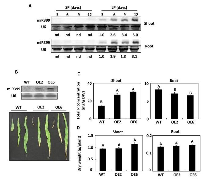 圖1:MIR399b過(guò)表達(dá)轉(zhuǎn)化玉米在水培下的表型,A,smallRNAnorthernblot顯示在Pi缺乏的玉米根和地上部分的miR399是上調(diào)的;B,水培下的MIR399b過(guò)表達(dá)玉米的Pi中毒表型;C,Pi缺乏條件下,野生型和突變體玉米中根和地上部分的P濃度;D,Pi缺乏條件下,野生型和突變體的根和地上部分的干重。