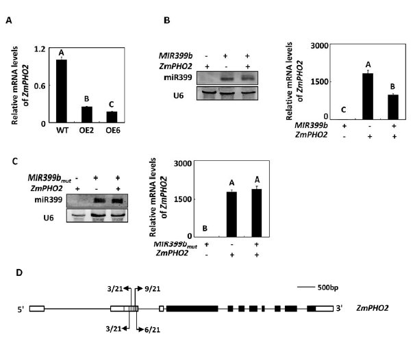 圖2:ZmPHO2被miR399轉(zhuǎn)錄后調(diào)控。A,qPCR檢測(cè)過(guò)表達(dá)轉(zhuǎn)化株的ZmPHO2轉(zhuǎn)錄本的表達(dá);B、C,通過(guò)northernblot檢測(cè)MIR399b/MIR399bmut和ZmPHO2在煙草中的表達(dá);D,通過(guò)5,RACE檢測(cè)ZmPHO2的切割位點(diǎn)