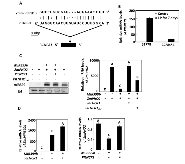 我們測(cè)試了兩個(gè)PILNCR1結(jié)構(gòu):一個(gè)全長(zhǎng)的PILNCR1和一個(gè)刪掉了miR399的互補(bǔ)區(qū)域的結(jié)構(gòu)(PILNCR1del)與本氏煙共表達(dá)兩天后,提取RNA,通過(guò)RT-qPCR分析ZmPHO2的表達(dá)。見(jiàn)圖5C,當(dāng)ZmmiR399b和PILNCR1共表達(dá)時(shí),ZmPHO2的表達(dá)被ZmmiR399b顯著降低。然而,當(dāng)ZmmiR399b與PILNCR1del共表達(dá)時(shí),ZmPHO2的表達(dá)水平被顯著降低,說(shuō)明PILNCR1的互補(bǔ)區(qū)域?qū)mmiR399的調(diào)控是非常重要的。圖5D,當(dāng)ZmmiR399b與玉米葉片的原生質(zhì)體共表達(dá)時(shí),同樣的結(jié)果也被獲得了。這些結(jié)果表明PILNCR1能有效較少ZmmiR399b的效應(yīng)。