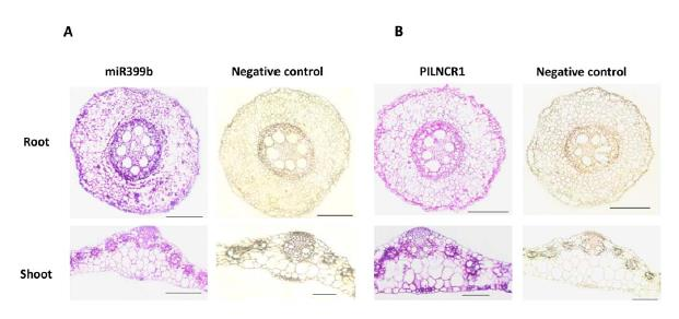 為了進(jìn)一步揭示ZmmiR399b和PILNCR1之間可能的關(guān)系,我們通過(guò)原位雜交驗(yàn)證ZmmiR399b和PILNCR1的表達(dá)模式。由于在磷充足條件下,ZmmiR399b和PILNCR1在玉米中的豐度比較低,于是去在pi缺乏條件下的第7天的玉米根和地上部分來(lái)驗(yàn)證ZmmiR399b和PILNCR1表達(dá)模式。ZmmiR399b和PILNCR1在玉米的根和地上部分均能被檢測(cè)到,尤其是在維管束里,見(jiàn)圖6A-B。這些結(jié)果顯示ZmmiR399b和PILNCR1的空間定位至少有部分是重合的。