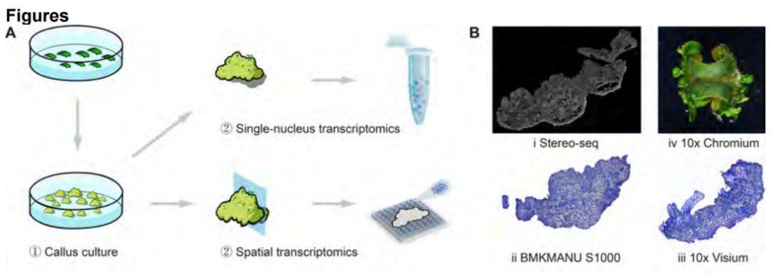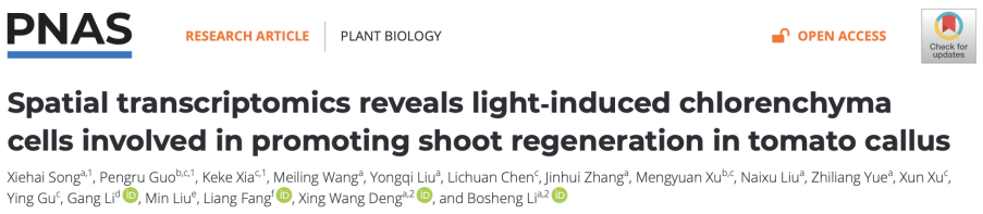 近日,北京大學(xué)現(xiàn)代農(nóng)業(yè)研究院的李博生研究員團(tuán)隊(duì)與鄧興旺院士團(tuán)隊(duì)在國際學(xué)術(shù)期刊PNAS上發(fā)表了題為“Spatial transcriptomics reveals light-induced chlorenchyma cells involved in promoting shoot regeneration in tomato callus”的研究論文,建立了植物愈傷組織芽再生的空間轉(zhuǎn)錄組圖譜。該研究利用了百創(chuàng)智造 BMKMANU S1000,華大BGI Stereo-seq,美國10x Visium三種空間轉(zhuǎn)錄組技術(shù)以及10X Chromium單細(xì)胞核轉(zhuǎn)錄組技術(shù),揭示了番茄愈傷組織內(nèi)部細(xì)胞的異質(zhì)性,并在單細(xì)胞水平上詳細(xì)解析了激素信號(hào)和重要調(diào)控因子在各種細(xì)胞和組織中的表達(dá)情況。研究結(jié)果不僅發(fā)現(xiàn)了表皮和芽原基細(xì)胞的亞型和功能,還揭示了綠色組織(chlorenchyma)細(xì)胞在芽原基細(xì)胞位置和分化發(fā)展中的重要作用,以及光照如何通過促進(jìn)綠色組織細(xì)胞的發(fā)育和激活雷帕霉素靶蛋白TOR來推動(dòng)芽再生過程。