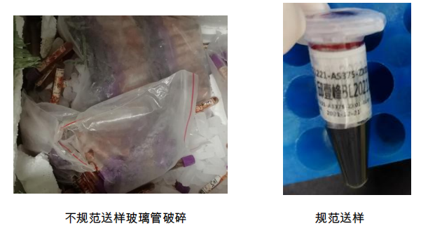 ②采集完血液之后需將血液轉(zhuǎn)移至 EP 管中,玻璃材質(zhì)采血管冷凍之后易碎不規(guī)范送樣玻璃管破碎 規(guī)范送樣