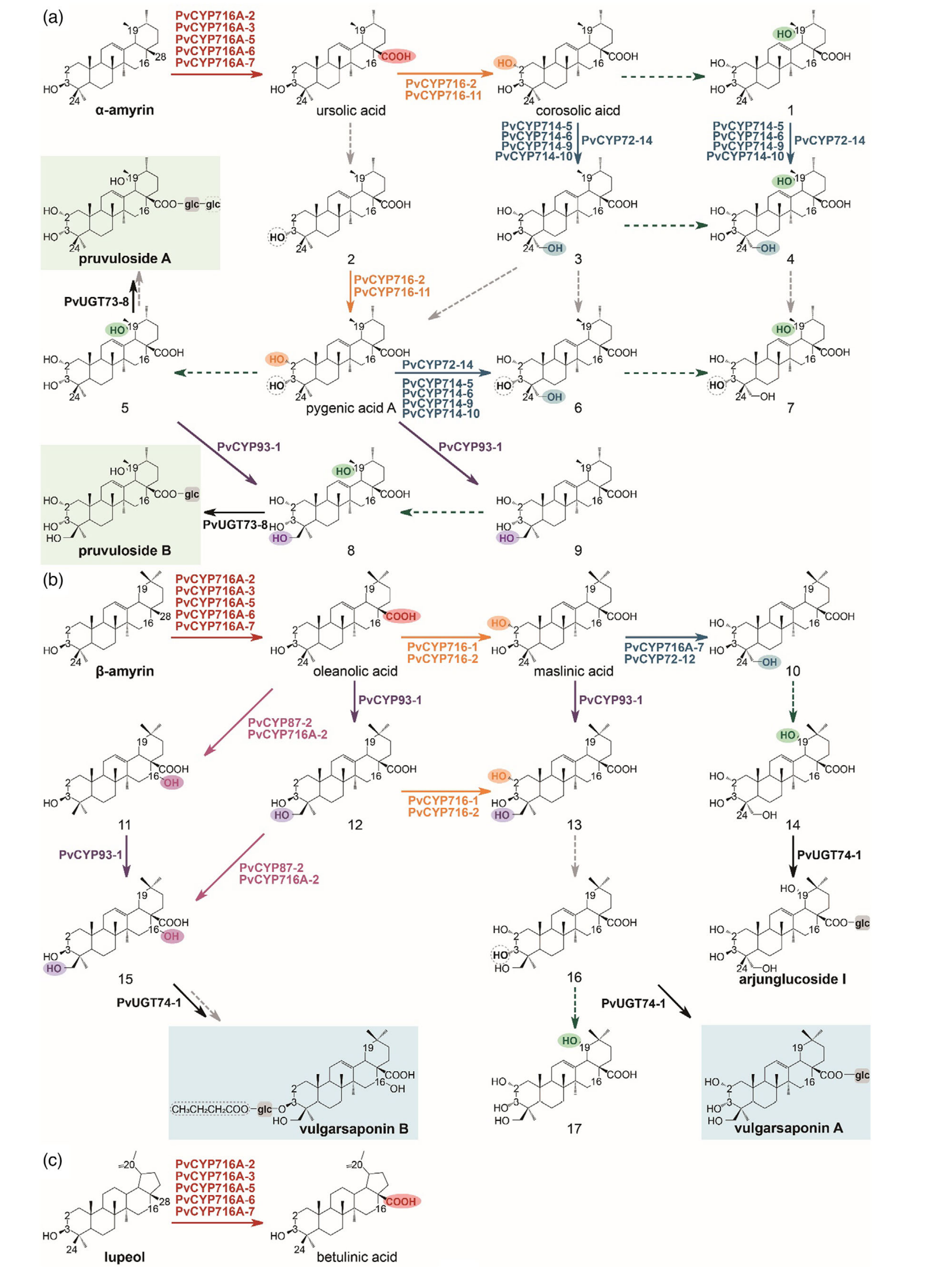 五環(huán)三萜及其皂苷是夏枯草中一類重要的生物活性成分,與夏枯草的抗癌和抗炎特性有關。三萜類化合物是植物中最大的次生代謝產物類別之一。根據骨架可分為無環(huán)三萜、雙環(huán)三萜、三環(huán)三萜、四環(huán)三萜、五環(huán)三萜、六環(huán)三萜等亞類。三萜的生物合成從MVA途徑的乙酰輔酶A和MEP途徑的丙酮酸與甘油醛-3-磷酸開始。MVA途徑主要作用于細胞質,在細菌、古菌與真核生物中都是保守的;而MEP途徑作用于質體,主要存在于真細菌和植物中。這兩種途徑都導致通用C5異戊二烯單元的生物合成。它們會聚在異戊烯二磷酸(IPP)和烯丙基二磷酸(DMAPP)上。經法尼基二磷酸合酶(FPPS)、角鯊烯合成酶(SQS)和角鯊烯環(huán)氧化酶(SQE)的連續(xù)催化,IPP和DMAPP轉化為三萜和甾體生物合成的關鍵中間體2,3-氧化角鯊烯。隨后,氧化角鯊烯環(huán)化酶(OSCs)通過椅-船-椅(C-B-C)構象催化中間體環(huán)化,生成達原甾醇陽離子,用于類固醇和大多數四環(huán)三萜的生物合成,或通過椅-椅-椅(C-C-C)構象生成達瑪烯基陽離子,用于生成五環(huán)三萜骨架。在植物中,循環(huán)產物的進一步修飾包括主要在細胞色素P450單加氧酶(CYPs)催化下的氧化和主要在尿苷二磷酸-糖基轉移酶(UGTs)催化下的糖基化。