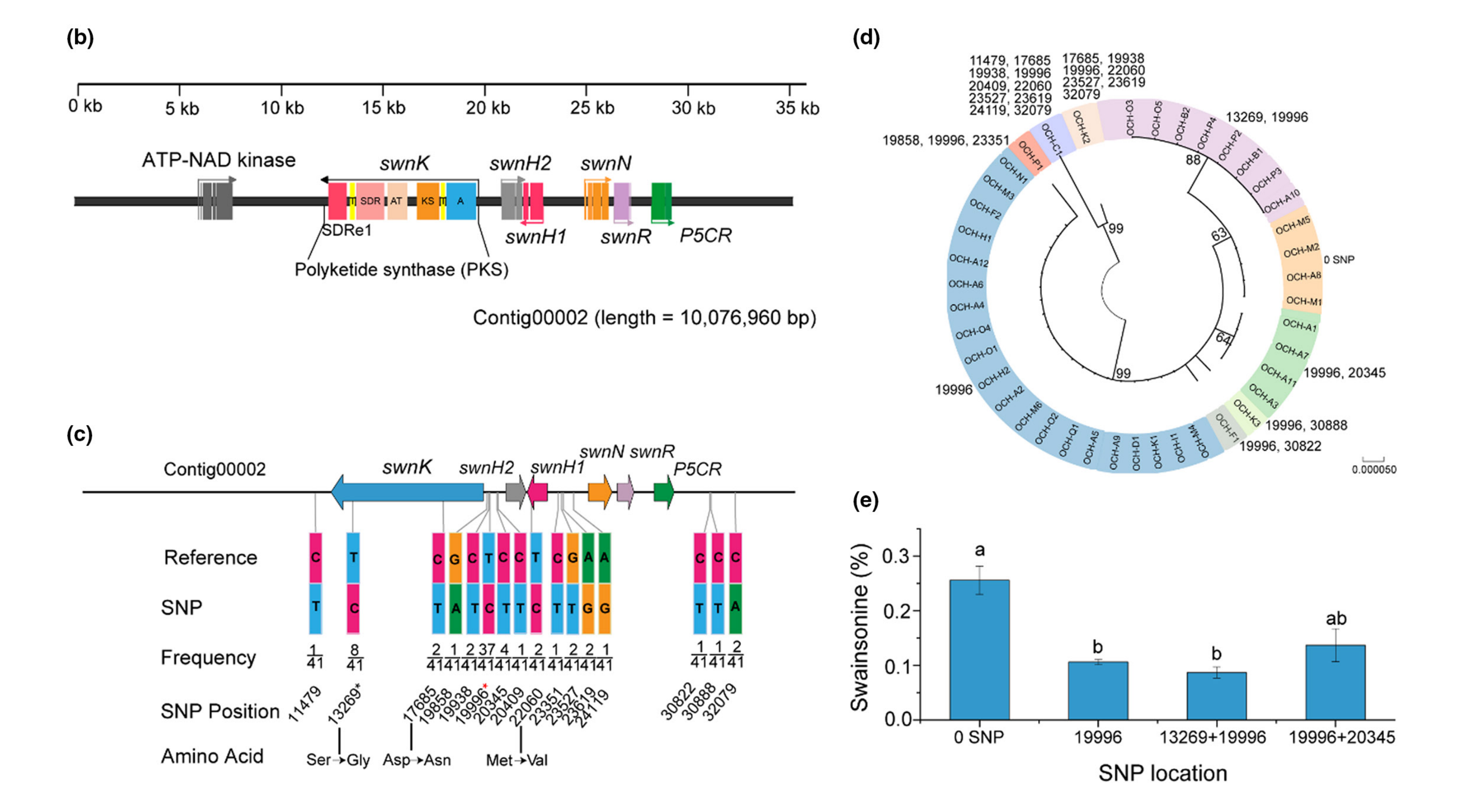 該研究豐富了前期推測(cè)的SW合成通路,進(jìn)一步分析顯示,一個(gè)編碼P5CR的基因位于SWN簇上,也包含在SWN的全長(zhǎng)序列中。對(duì)從中國(guó)3個(gè)省13個(gè)地理位置采集的黃花棘豆種分離的41株A.oxytropis的重測(cè)序分析顯示,一個(gè)位點(diǎn)SNP19996與SW含量相關(guān)。