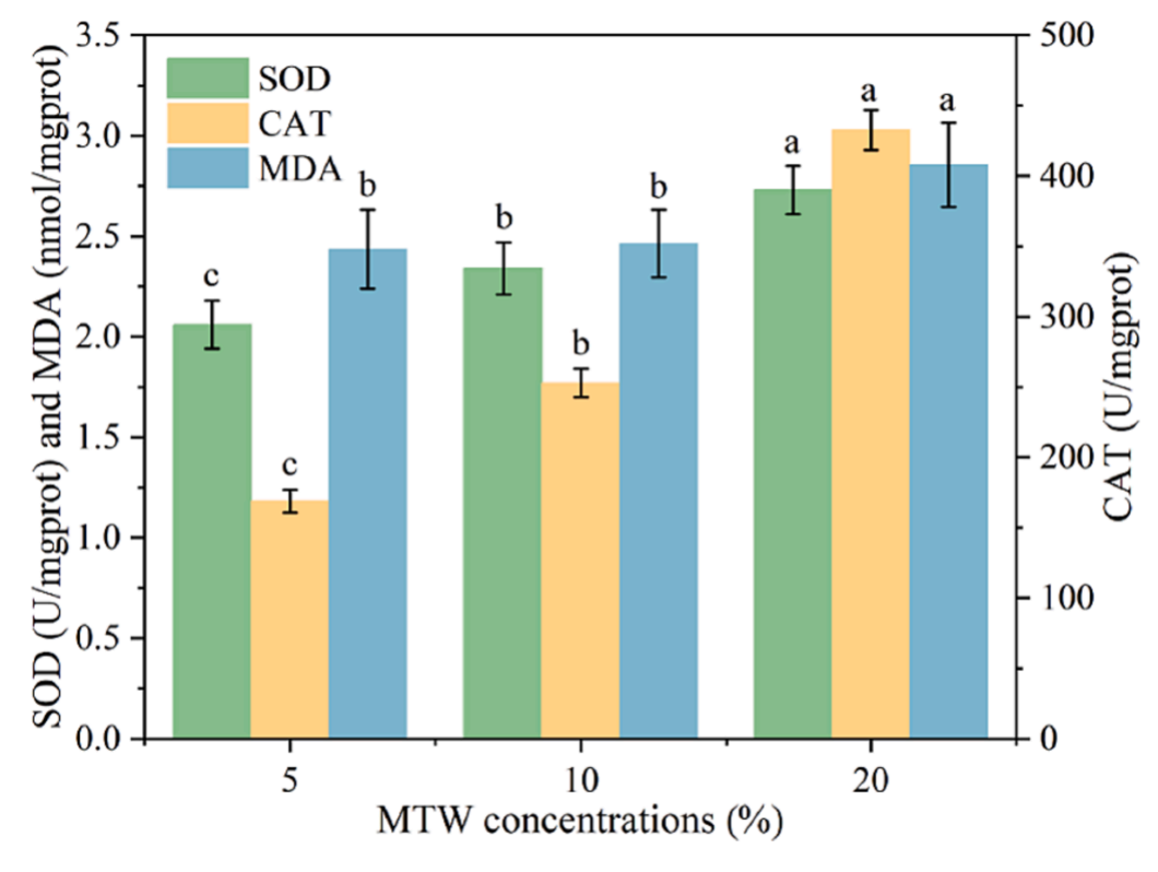 隨著PMW濃度的增加,微藻-細(xì)菌聯(lián)合體分泌的ROS和MDA也逐漸增加。這再次證明,與5%和20%的PMW相比,10%的PMW是廢水處理和C. muelleri培養(yǎng)的最佳初始濃度。