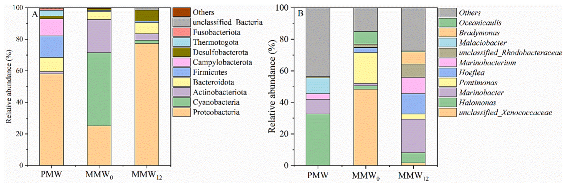 為了進(jìn)一步明確細(xì)菌在系統(tǒng)中的作用,在門和屬水平上的10個(gè)優(yōu)勢分類群如圖5A和5B所示。Proteobacteria豐度在PMW中達(dá)到58%,與C. muelleri在MMW12共培養(yǎng)條件下增加到77%。變形桿菌中含有多種促進(jìn)氮轉(zhuǎn)化和有機(jī)物降解的功能菌株。此外,與PMW相比,MMW12組放線菌和藍(lán)藻菌的豐度也有所增加。