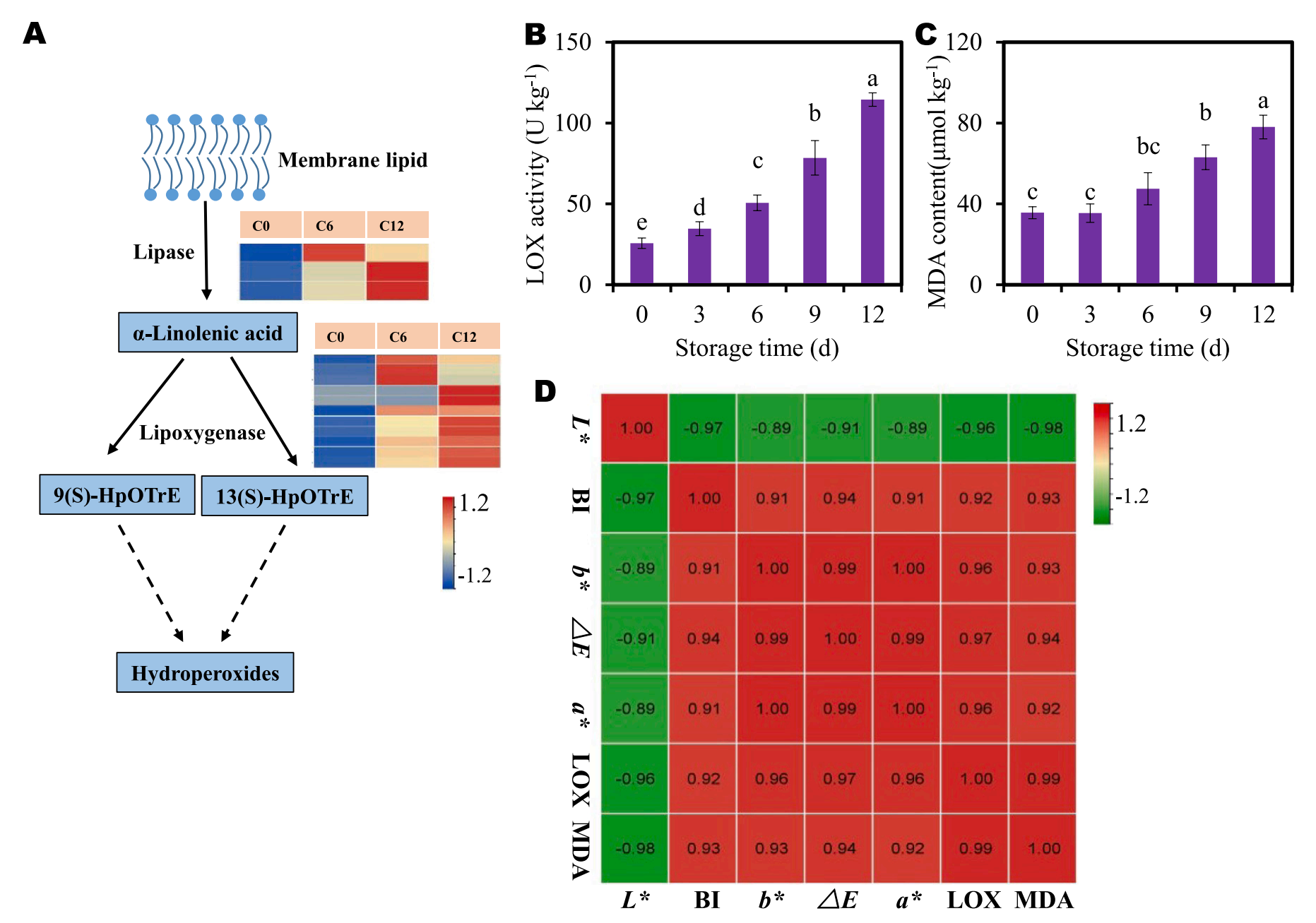丙二醛通常被認(rèn)為是植物脂質(zhì)過氧化的生物標(biāo)志物。為了監(jiān)測切片芋頭褐變過程中膜脂過氧化情況,測定了LOX活性和MDA含量。隨著時間的推移,LOX活性和MDA含量隨著褐變繼續(xù)進行逐漸升高 (圖7B, C)。這些結(jié)果表明,在褐變過程中,膜脂過氧化加劇。此外,相關(guān)分析顯示,LOX活性、MDA含量和其他褐變指標(biāo)之間存在很強的相關(guān)性?(圖7D)。這些結(jié)果進一步支持了膜脂過氧化和/或代謝參與芋頭褐變。