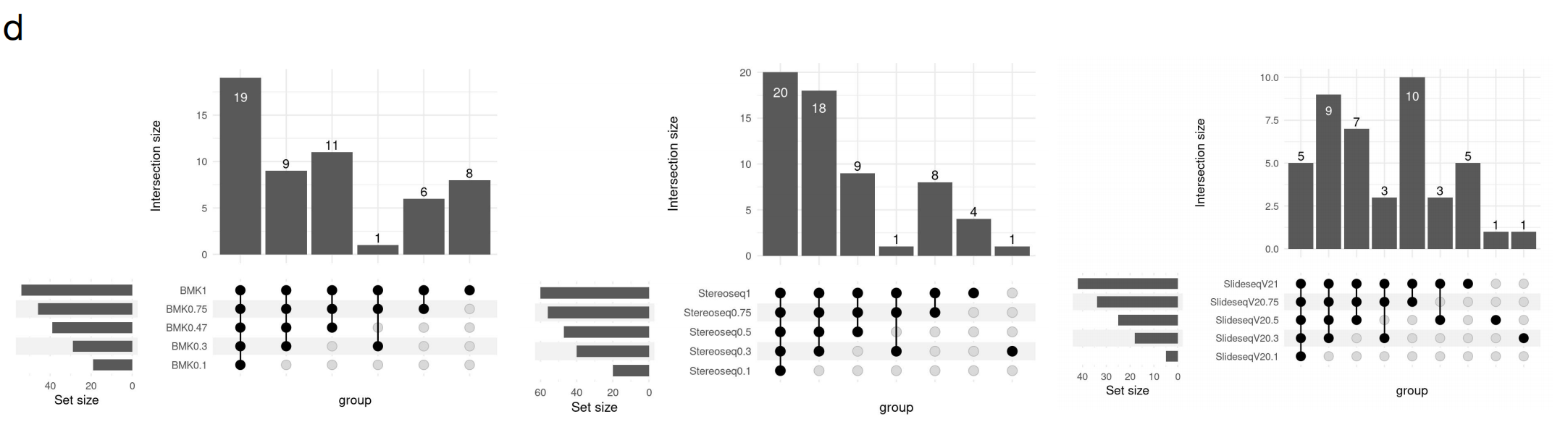 文中對visium(polyA-based)未能捕獲到的基因,在其它技術(shù)平臺中的表現(xiàn)也做了統(tǒng)計,其中BMKMANU S1000、Stereo-seqSlide-seqV2都展現(xiàn)出了統(tǒng)一且全面的基因捕獲性能。