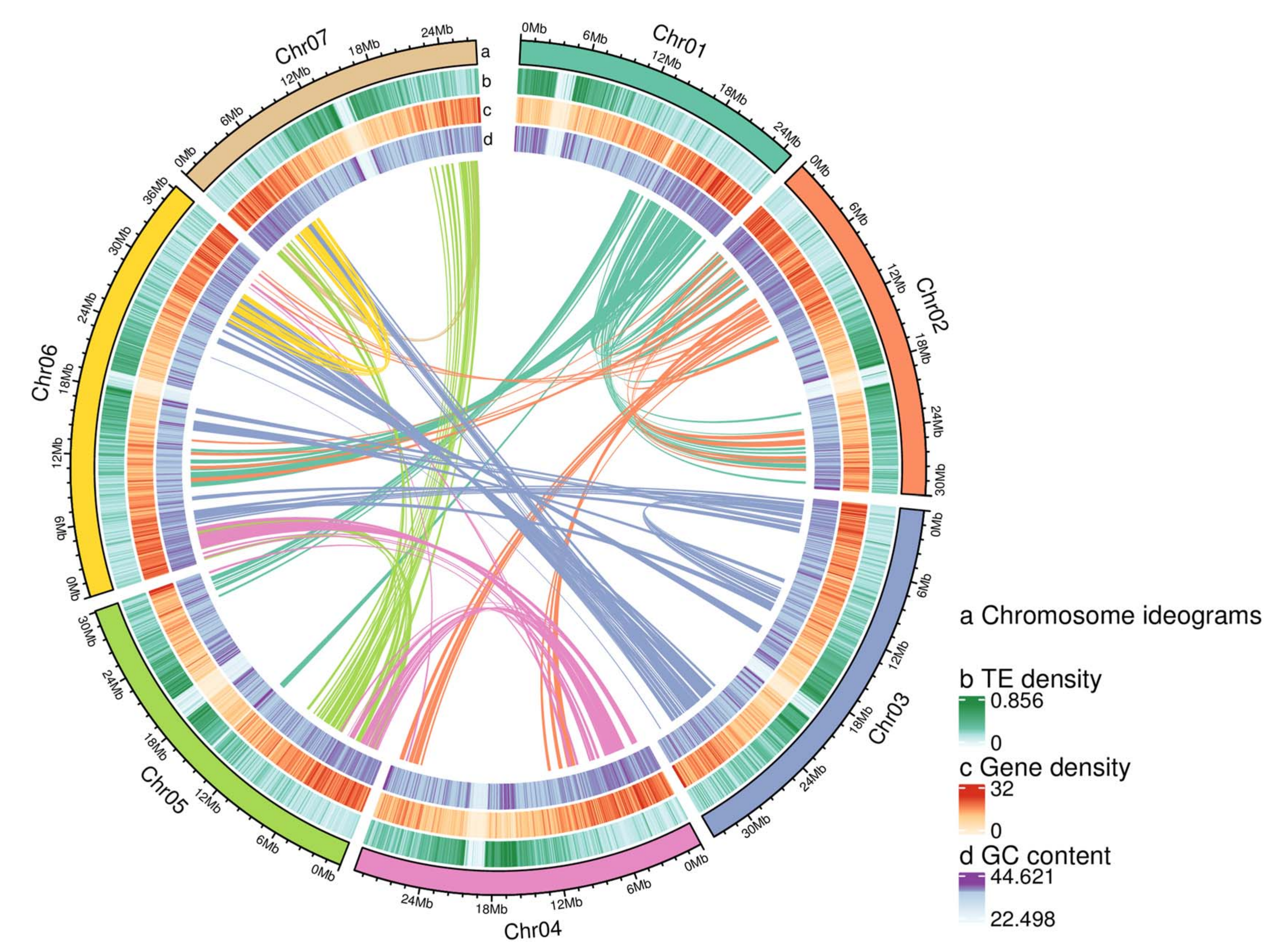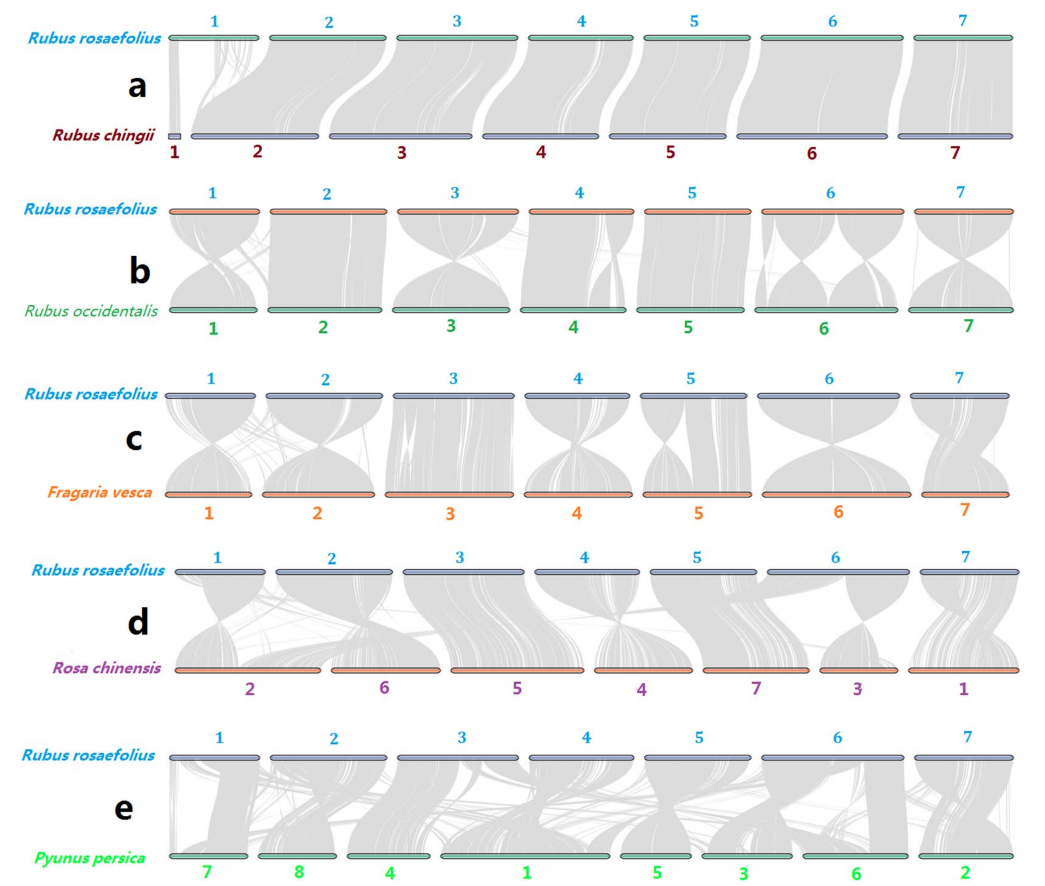 所有的植物都有一個(gè)或遠(yuǎn)或近的共同祖先。通過共線性分析發(fā)現(xiàn):在1號(hào)染色體的一端和其他6條染色體上,發(fā)現(xiàn)了完整且平行的同源物,但在1號(hào)染色體的另一端缺失了大同源塊(圖3a)。這些結(jié)果表明,空心藨和紅覆盆子之間沒有發(fā)生大的染色體變異,但在空心藨和紅覆盆子基因組草圖的組裝或注釋中隱藏了錯(cuò)誤。該研究發(fā)現(xiàn),空心藨和紅覆盆子之間所有染色體的共線性幾乎是完整的(圖3b),這表明上述1號(hào)染色體的組裝或注釋錯(cuò)誤可能在空心藨中沒有發(fā)生。當(dāng)忽略單倍型中支架組裝方向的干擾時(shí),1、2、3、5、7號(hào)染色體幾乎完全平行共線性,4號(hào)染色體可能發(fā)生較大反轉(zhuǎn),6號(hào)染色體可能發(fā)生3次或更少的反轉(zhuǎn)(圖3b)。這些發(fā)現(xiàn)表明,隨著親緣關(guān)系距離的增加,復(fù)雜染色體變異的數(shù)量增加。