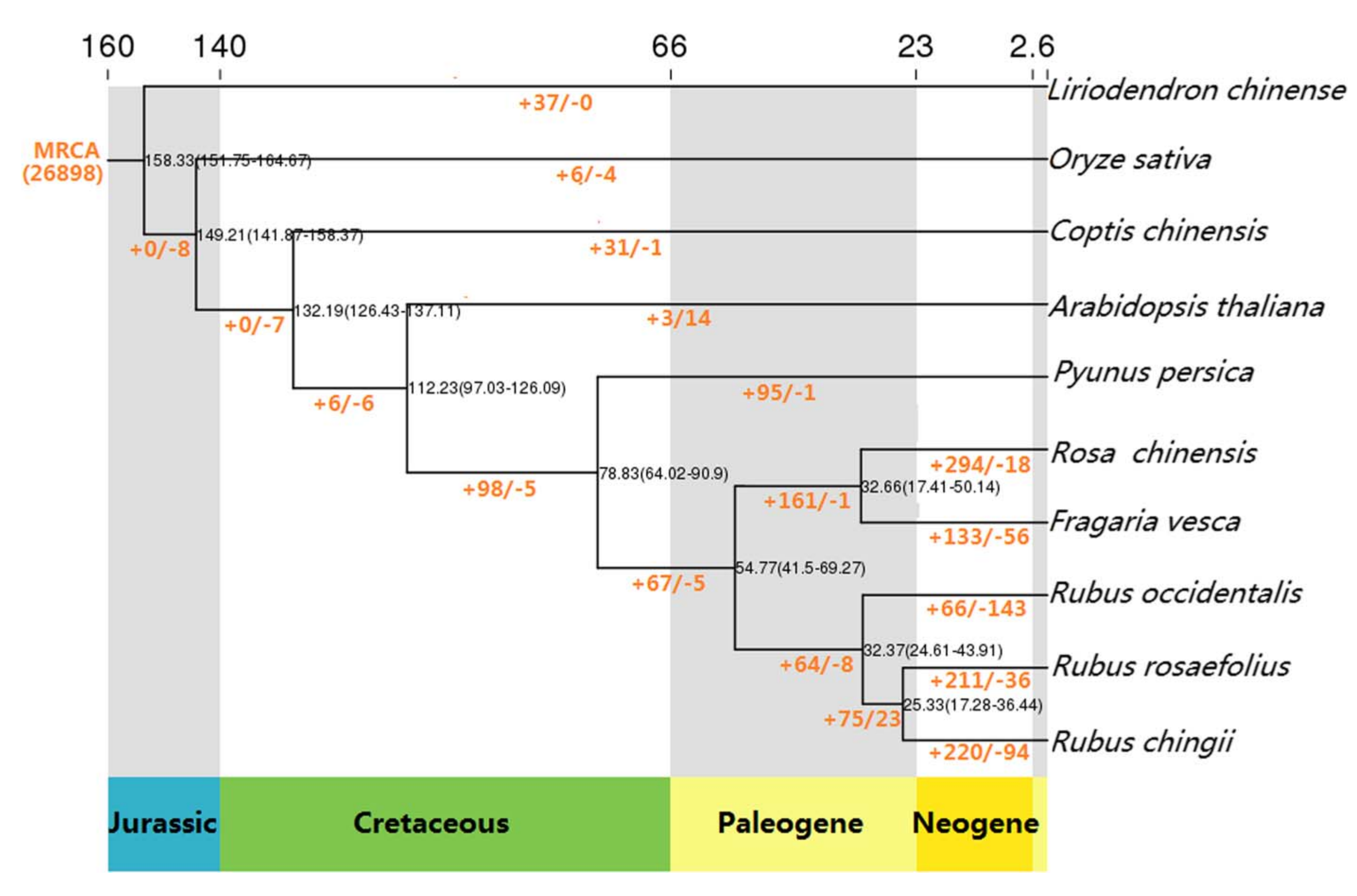 為了研究空心藨的進(jìn)化關(guān)系,該研究分析比較了玫瑰、黃連、鵝掌楸、水稻、擬南芥、月季、花薔薇、桃李、中國(guó)栗、西方栗的基因集數(shù)據(jù)。系統(tǒng)發(fā)育樹顯示,薔薇科出現(xiàn)在白堊紀(jì),覆盆子出現(xiàn)在古近紀(jì),空心藨和另一種紅覆盆子R. chingii在1728-3644萬年前(mya)從最近的共同祖先分化而來,隨后空心藨的211個(gè)基因家族和36個(gè)基因家族分別擴(kuò)張和收縮(圖2),這些擴(kuò)展家族中的基因主要富集于代謝途徑,如“DNA聚合酶”、“光合作用”、“晝夜節(jié)律”和“半乳糖代謝”。