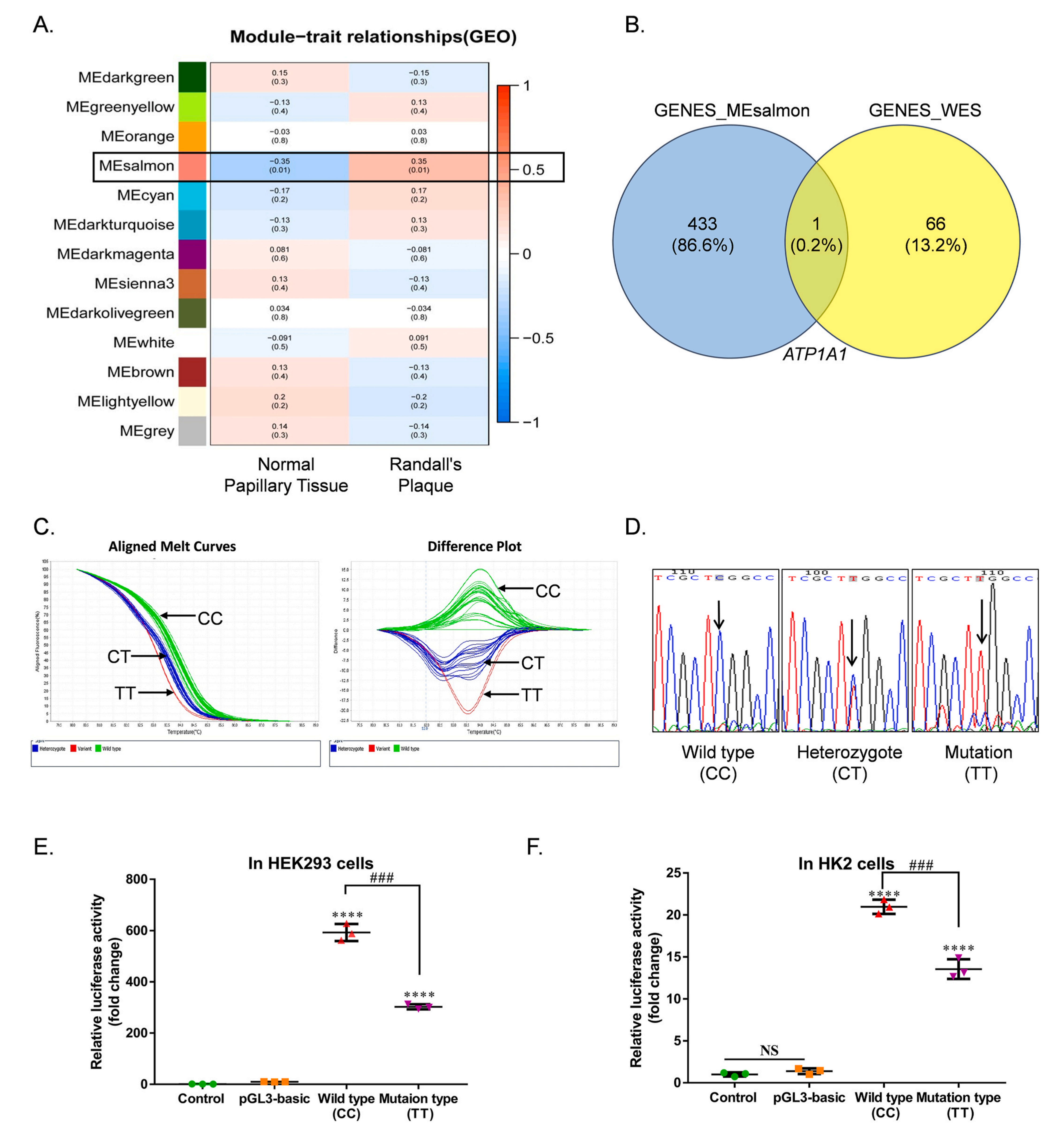 為進一步探究腎結(jié)石相關(guān)關(guān)鍵基因,該研究對28例中國漢族CaOx結(jié)石患者進行了WES分析,共鑒定得到76個SNPs,其中錯義SNPs31個,編碼同義SNPs30個,3′UTR7個SNPs,5′UTR區(qū)8個SNPs,作為候選SNPs,這些突變位點定位于67個基因,將這67個基因與WGCNA分析中的434個基因做韋恩圖取交集,發(fā)現(xiàn)ATP1A1是兩個數(shù)據(jù)集交叉點中的唯一基因,一定程度上說明了ATP1A1在鈣結(jié)石形成中的潛在作用。