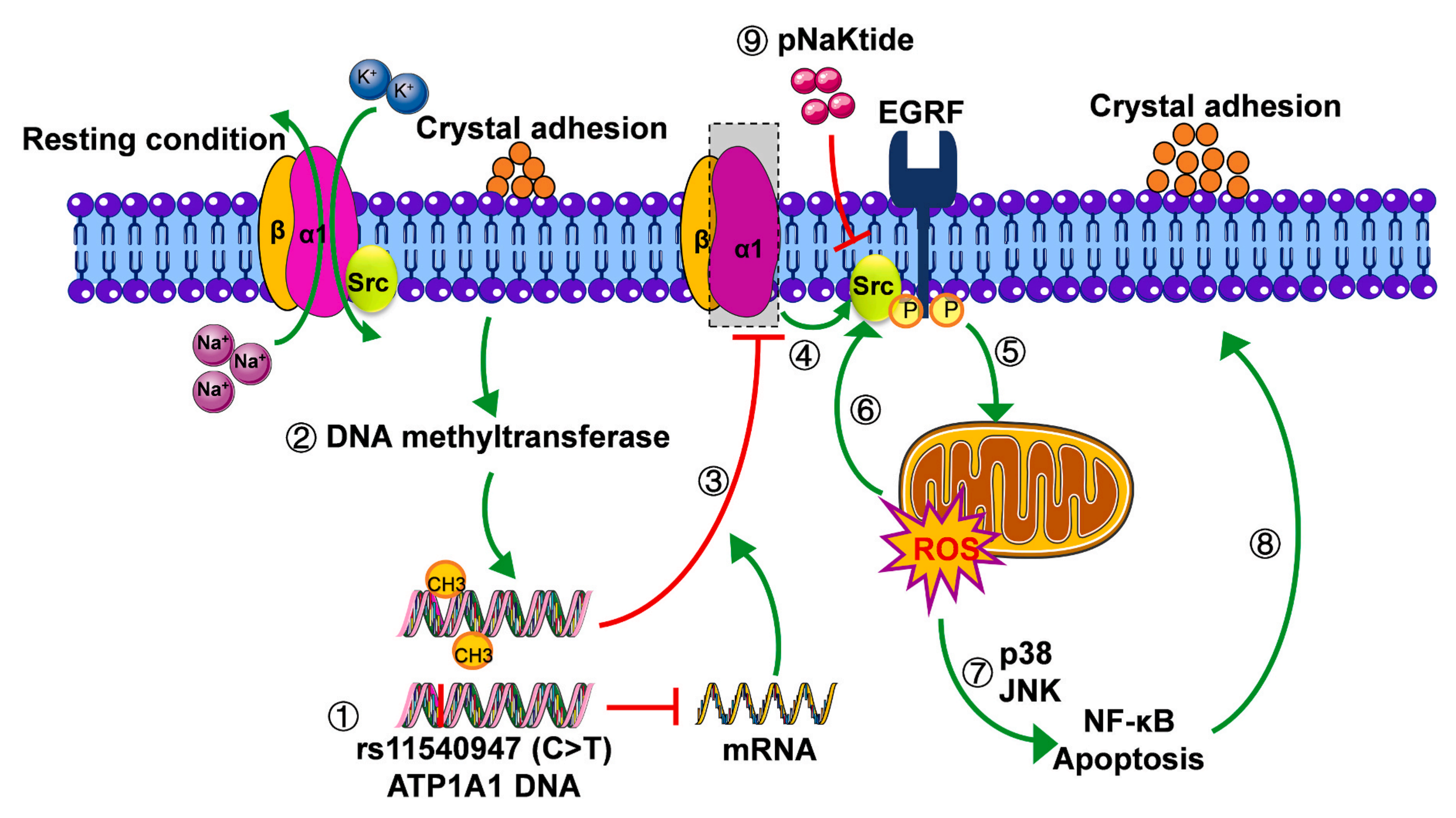 晶體與細(xì)胞的粘附是結(jié)石形成的關(guān)鍵過程,晶體沉積會損傷腎細(xì)胞,因此,作者研究了ATP1A1在晶體-細(xì)胞粘附中的作用。該研究觀察到用 Ad-hATP1A1 感染和用 pNaKtide 處理后,Ca2+濃度與對照組相比顯著降低,表明ATP1A1過表達(dá)和pNaKtide可以阻止晶體與細(xì)胞的粘附,從而保護細(xì)胞免受CaOx晶體誘導(dǎo)的損傷并減少腎結(jié)石的形成。DNA啟動子中CpG島的甲基化是基因沉默的常見機制,COM暴露后,DNA甲基轉(zhuǎn)移酶(DNMTs)的mRNA和蛋白質(zhì)水平均顯著升高,而用DNA甲基化抑制劑5Aza-2dc預(yù)處理HK2細(xì)胞再進行COM暴露處理后,ATP1A1表達(dá)量下調(diào);ATP1A1的蛋白水平也被逆轉(zhuǎn)。這些結(jié)果表明,改變的DNA甲基化參與了COM誘導(dǎo)的ATP1A1降低。