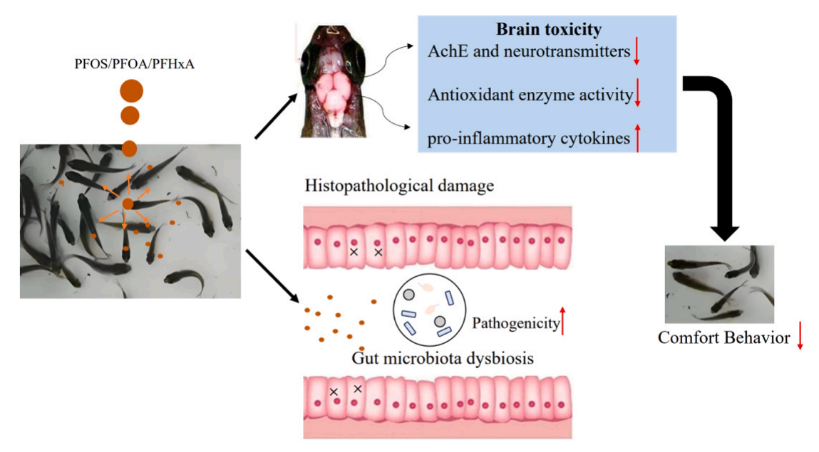 水污染和PFAS殘留已成為全球性的環(huán)境問(wèn)題。暴露于PFAS已被證明會(huì)引起毒性作用。然而,在大多數(shù)研究中,PFAS暴露濃度很高,導(dǎo)致研究結(jié)果低估了實(shí)際環(huán)境濃度下的毒性作用。魚(yú)是脊椎動(dòng)物中最大、種類最多的一類。魚(yú)類作為胚胎學(xué)、神經(jīng)生物學(xué)和環(huán)境生物學(xué)研究的實(shí)驗(yàn)?zāi)P驮絹?lái)越有用。鯽魚(yú)(Carassius auratus)因其口感鮮美、營(yíng)養(yǎng)價(jià)值高而成為人們喜愛(ài)的淡水魚(yú),由于適應(yīng)性強(qiáng),鯽魚(yú)養(yǎng)殖地區(qū)多,分布廣泛,2020年占淡水養(yǎng)殖魚(yú)類總產(chǎn)量的8.90%。因此,研究鯽魚(yú)對(duì)不同污染物的應(yīng)激反應(yīng)具有重要意義。該研究主要研究了PFAS對(duì)鯽魚(yú)神經(jīng)系統(tǒng)和腸道菌群的毒性,腦和腸道組織病理學(xué)變化表明,PFAS加重了對(duì)鯉魚(yú)腦和腸道組織病理學(xué)的影響。