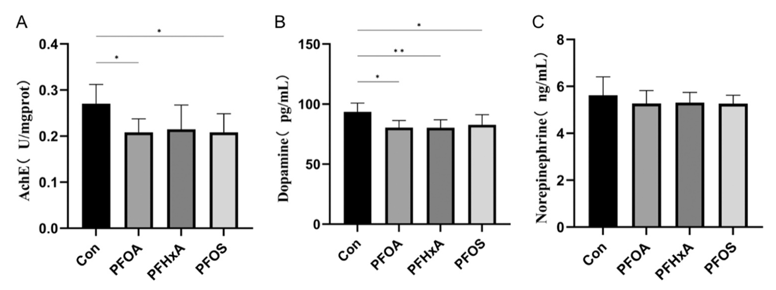 研究了PFAS對(duì)鯽魚(yú)腦組織乙酰膽堿酯酶和神經(jīng)遞質(zhì)活性的影響。與Con組相比,PFOA和PFOS組腦內(nèi)乙酰膽堿酯酶活性顯著降低。此外,PFOA、PFHxA和PFOS組多巴胺(DA)水平顯著降低(圖2B)。然而,去甲腎上腺素(NE)水平在實(shí)驗(yàn)魚(yú)組之間沒(méi)有顯著變化(圖2C)。這些結(jié)果表明,PFAS暴露抑制了魚(yú)腦中的AChE和神經(jīng)遞質(zhì)水平,并影響了整體腦功能。