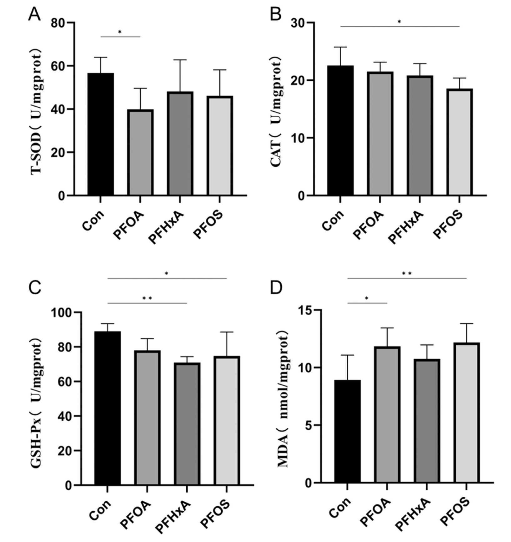 處理?xiàng)l件:對(duì)照組(Con)、全氟辛烷磺酸(PFOS)、全氟辛酸(PFOA)、十一氟己酸(PFHxA)組指標(biāo)檢測(cè):過(guò)氧化氫酶(CAT)、總超氧化物歧化酶(T-SOD)、谷胱甘肽過(guò)氧化物酶(GSH-Px)、丙二醛(MDA)、乙酰膽堿酯酶(AChE)