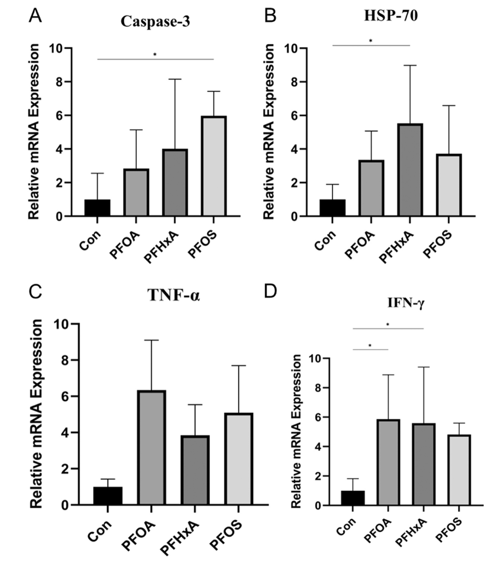PFOS組與Con組相比,應(yīng)激相關(guān)基因caspase-3的表達(dá)顯著升高(圖5A)。同樣,在PFHxA組中,HSP-70的表達(dá)顯著增加(圖5B)。此外,促炎細(xì)胞因子INF-γ在PFOA和PFHxA組中的表達(dá)水平顯著升高(圖5D),而TNF-α的表達(dá)在兩組間無(wú)顯著差異(圖5C)。