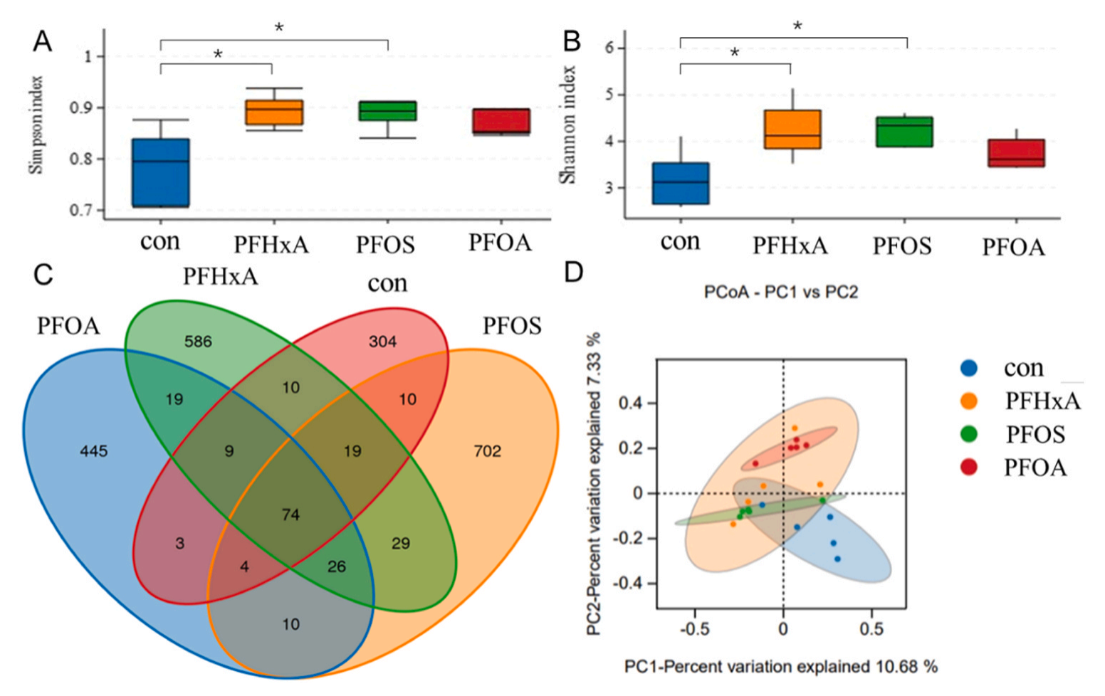 與Con組相比,PFHxA和PFOS組細(xì)菌群落的Simpson和Shannon指數(shù)明顯高于Con組(圖6A和B),表明細(xì)菌物種多樣性有所增加。基于OTU的venn圖分析(圖6C),四組之間重疊OTUs數(shù)量相對(duì)較少(不超過(guò)100個(gè)),各組特有的OTUs相對(duì)較多(均超過(guò)300個(gè))。圖6D清楚地顯示了Con組與其他三組在微生物群方面的顯著差異,表明PFAS暴露引起了鯽魚(yú)腸道微生物群組成的變化。