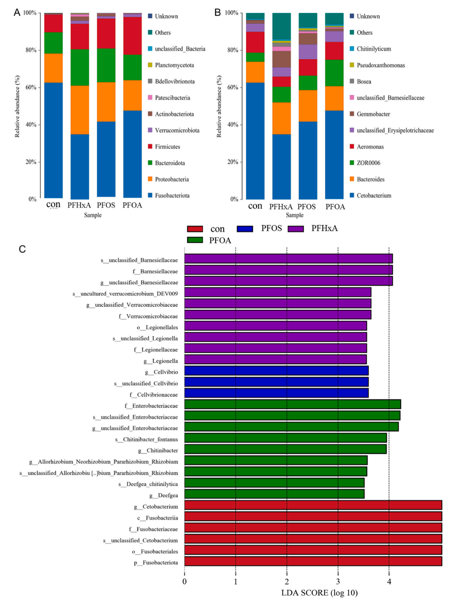 在門水平上,與Con組相比,PFHxA、PFOS和PFOA組梭桿菌門的豐度減少,而變形菌門、擬桿菌門、厚壁菌門、Verrucomicrobiota和放線菌門的豐度增加(圖7A)。在屬水平上,與Con組相比,PFHxA、PFOA和PFOA組中Cetobacterium的豐度降低,Bacteroides、unclassified_ErysipelotrichaceaeGemmobacter的豐度增加(圖7B)。采用基于不同處理的LEfSe進(jìn)行線性判別分析(LDA),確定Con組與各PFAS處理組間的種數(shù)有統(tǒng)計(jì)學(xué)差異。如圖7C所示,PFHxA組Verrucomicrobiaceae、LegionellaceaeLegionella豐度顯著增加,PFOS組Cellvibrio豐度顯著增加,PFOA組EnterobacteriaceaeDeefgea豐度顯著增加。這些結(jié)果表明,PFAS暴露改變了鯽魚(yú)腸道菌群組成,增加了潛在致病菌的數(shù)量。