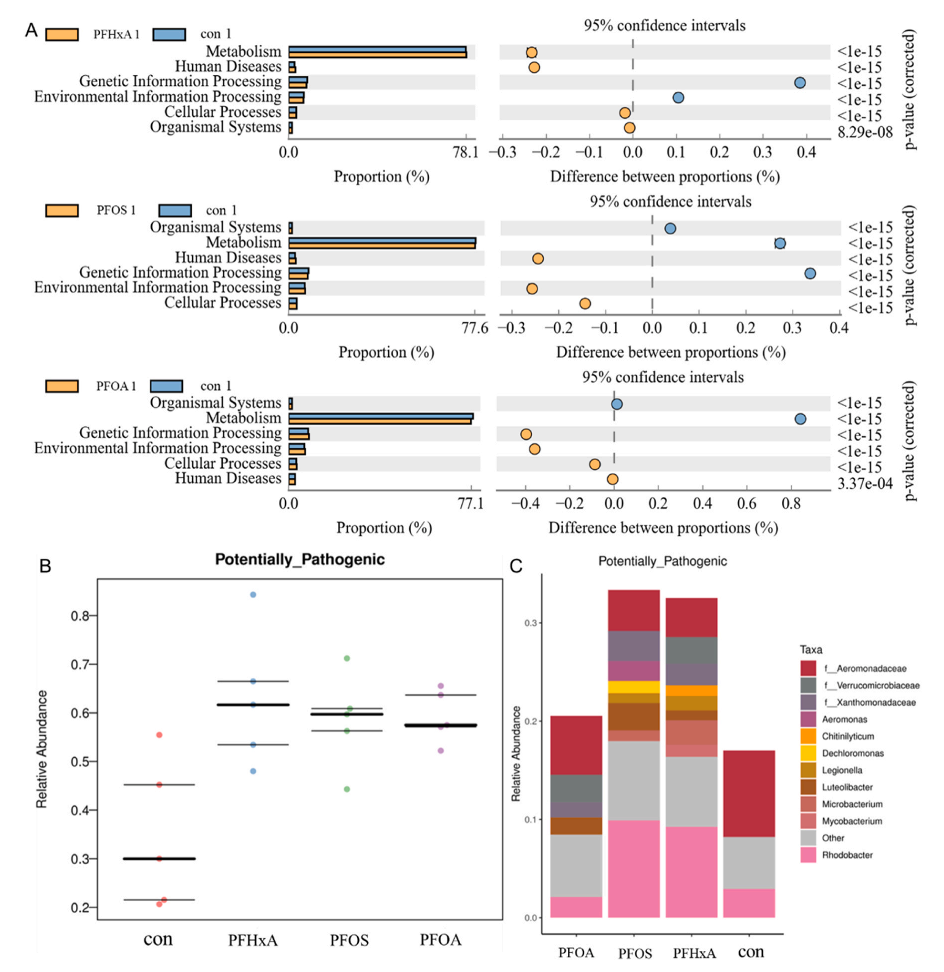 根據(jù)PICRUSt2,根據(jù)特征序列預(yù)測(cè)整個(gè)群落的通路變化,并進(jìn)行功能基因差異分析。與Con組相比,所有三個(gè)PFAS治療組都顯著改善了人類疾病中涉及的細(xì)胞過(guò)程和信號(hào)通路(圖8A)。利用BugBase對(duì)表型分類進(jìn)行預(yù)測(cè)。與Con組相比,每個(gè)PFAS治療組顯著增加了微生物群的潛在致病性(圖8B)。在屬水平上,與Con組相比,各PFAS處理組增加了Luteolibacter的相對(duì)豐度,PFOS和PFHxA組增加了RhodobacterLegionella的相對(duì)豐度,PFOS組增加了decchloromonasAeromonas的相對(duì)豐度(圖8C)。這些結(jié)果表明,PFAS可能導(dǎo)致鯽魚(yú)腸道菌群的潛在致病性增加。