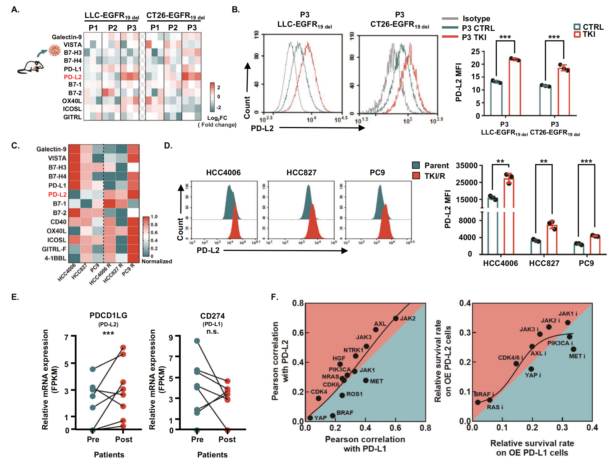 為了探索腫瘤免疫環(huán)境變化的原因,作者同時(shí)檢測(cè)了不同傳代階段腫瘤組織中刺激性和抑制性免疫調(diào)節(jié)分子的表達(dá)。在 EGFR-TKI 的初始治療中,一些抑制性免疫檢查點(diǎn)的相對(duì)表達(dá)降低(圖隨著耐藥性的出現(xiàn),抑制性免疫檢查點(diǎn)基因 PD-L1 和 PD-L2 的相對(duì)表達(dá)水平逐漸升高,尤其是 PD-L2 (圖3A)。為了進(jìn)一步驗(yàn)證 PD-L2 在 EGFR-TKI 耐藥腫瘤細(xì)胞中表達(dá)的增加,作者通過流式細(xì)胞術(shù)鑒定了 PD-L2 在 P3 腫瘤細(xì)胞厄洛替尼或奧希替尼處理的腫瘤細(xì)胞(耐藥,TKI 組)表面的表達(dá),以生理鹽水處理的細(xì)胞為對(duì)照(敏感,CTRL 組)。作者的結(jié)果表明,與對(duì)照組織相比,腫瘤細(xì)胞表面 PD-L2 的表達(dá)在耐藥腫瘤組織中表現(xiàn)出顯著增加(圖3B)。接下來,為了進(jìn)一步驗(yàn)證,作者分析了先前構(gòu)建的 EGFR 突變的 TKI 耐藥 NSCLC 細(xì)胞系 HCC4006R、HCC827R、PC9R 及其配對(duì)親本細(xì)胞中免疫檢查點(diǎn)標(biāo)志物的表達(dá)水平。在三種耐藥細(xì)胞系中,PD-L2 的 mRNA 和蛋白表達(dá)水平顯著上調(diào),而 PD-L1 的表達(dá)表現(xiàn)出不一致的變化(圖3C、D)。