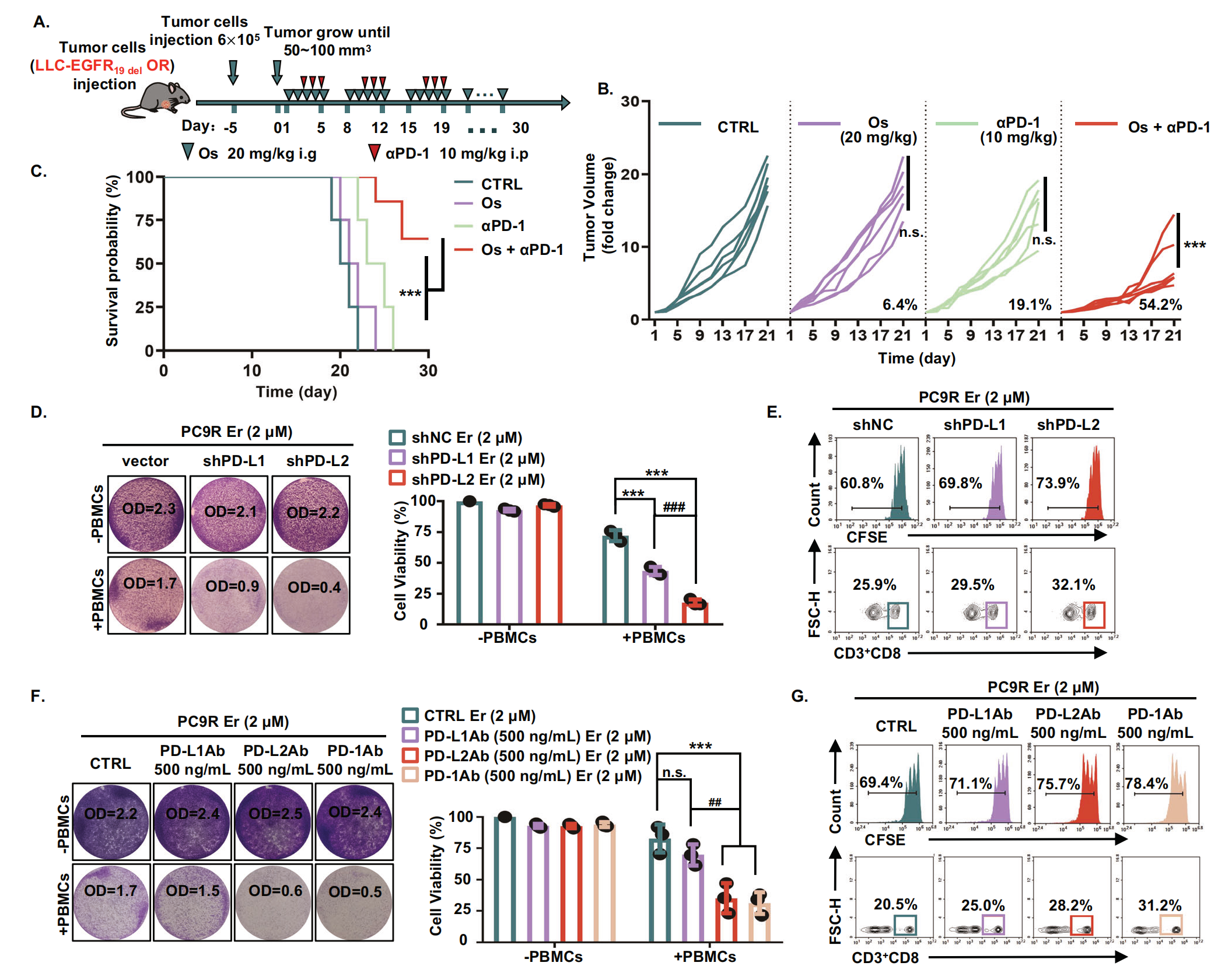 接下來,作者想進(jìn)一步探討阻斷 EGFR-TKI 耐藥細(xì)胞中的 PD-L2/PD-1 是否可以通過增強(qiáng)免疫反應(yīng)來增強(qiáng)腫瘤細(xì)胞對(duì) EGFR-TKIs 的敏感性。作者建立了攜帶對(duì)奧希替尼耐藥的 LLC-EGFR19del?衍生腫瘤的同基因小鼠模型。小鼠接受生理鹽水 (CTRL)、奧希替尼 (Os)、抗 PD-1 (αPD-1) 和奧希替尼 + 抗 PD-1 (Combi) 治療(圖5A)。作者的結(jié)果表明,與 CTRL 組相比,單獨(dú)使用奧希替尼組小鼠的腫瘤體積和生存時(shí)間沒有顯著差異。PD-1 抑制劑對(duì) EGFR-TKI 耐藥腫瘤表現(xiàn)出部分抑制,并導(dǎo)致小鼠存活時(shí)間適度延長(zhǎng),盡管沒有統(tǒng)計(jì)學(xué)意義。然而,奧希替尼和抗 PD-1 的組合顯著抑制了腫瘤生長(zhǎng)并延長(zhǎng)了攜帶耐藥腫瘤的小鼠的生存期(圖5B,C)。以上結(jié)果表明,抑制 PD-1 與 EGFR-TKI 聯(lián)合有效抑制了 EGFR-TKI 耐藥腫瘤的生長(zhǎng)。