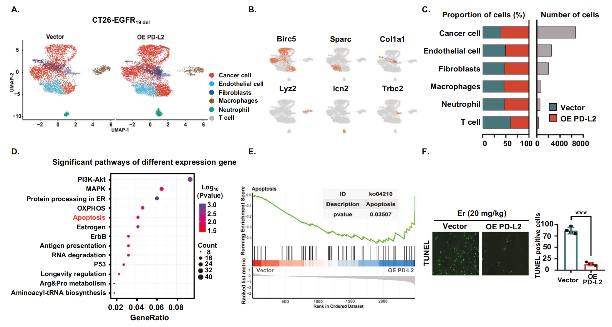 接下來,作者進(jìn)一步探討了 PD-L2 表達(dá)升高影響免疫反應(yīng)以降低腫瘤對(duì) EGFR-TKIs 敏感性的機(jī)制。作者獲得了來自空載體或 PD-L2 過表達(dá)的同基因小鼠中 CT26-EGFR19del?細(xì)胞的腫瘤組織的單細(xì)胞轉(zhuǎn)錄組譜。作者對(duì)來自空載體樣本和 PD-L2 過表達(dá)樣本的整合單細(xì)胞數(shù)據(jù)集進(jìn)行了聚類分析,并確定了六個(gè)主要的不同細(xì)胞群(圖6A、B)。作者發(fā)現(xiàn) PD-L2 過表達(dá)組中癌細(xì)胞的數(shù)量顯著增加,T 細(xì)胞的比例顯著降低(圖6C)。為了探索 EGFR-TKIs 耐藥的機(jī)制,作者分析了癌細(xì)胞的轉(zhuǎn)錄組特征。與空載體組相比,對(duì) PD-L2 過表達(dá)組的差異表達(dá)基因進(jìn)行 KEGG 富集分析。作者觀察到細(xì)胞凋亡通路顯著富集(圖 6D)。GSEA 分析顯示,PD-L2 過表達(dá)組癌細(xì)胞中與細(xì)胞凋亡途徑相關(guān)的基因顯著下調(diào)(圖6E)。這些結(jié)果表明,EGFR 突變腫瘤細(xì)胞中 PD-L2 表達(dá)的增加可導(dǎo)致細(xì)胞凋亡減少。作者的體內(nèi)實(shí)驗(yàn)數(shù)據(jù)進(jìn)一步驗(yàn)證了這些結(jié)論。TUNEL 染色顯示,與對(duì)照組相比,TKI 處理后 CT26-EGFR19del?PD-L2 過表達(dá)組腫瘤細(xì)胞凋亡受到顯著抑制(圖6F)?;谶@些結(jié)果,作者假設(shè) EGFR 突變的腫瘤細(xì)胞中 PD-L2 表達(dá)增加會(huì)抑制癌細(xì)胞的凋亡,從而導(dǎo)致癌細(xì)胞的持續(xù)生長(zhǎng),耐藥性增加。