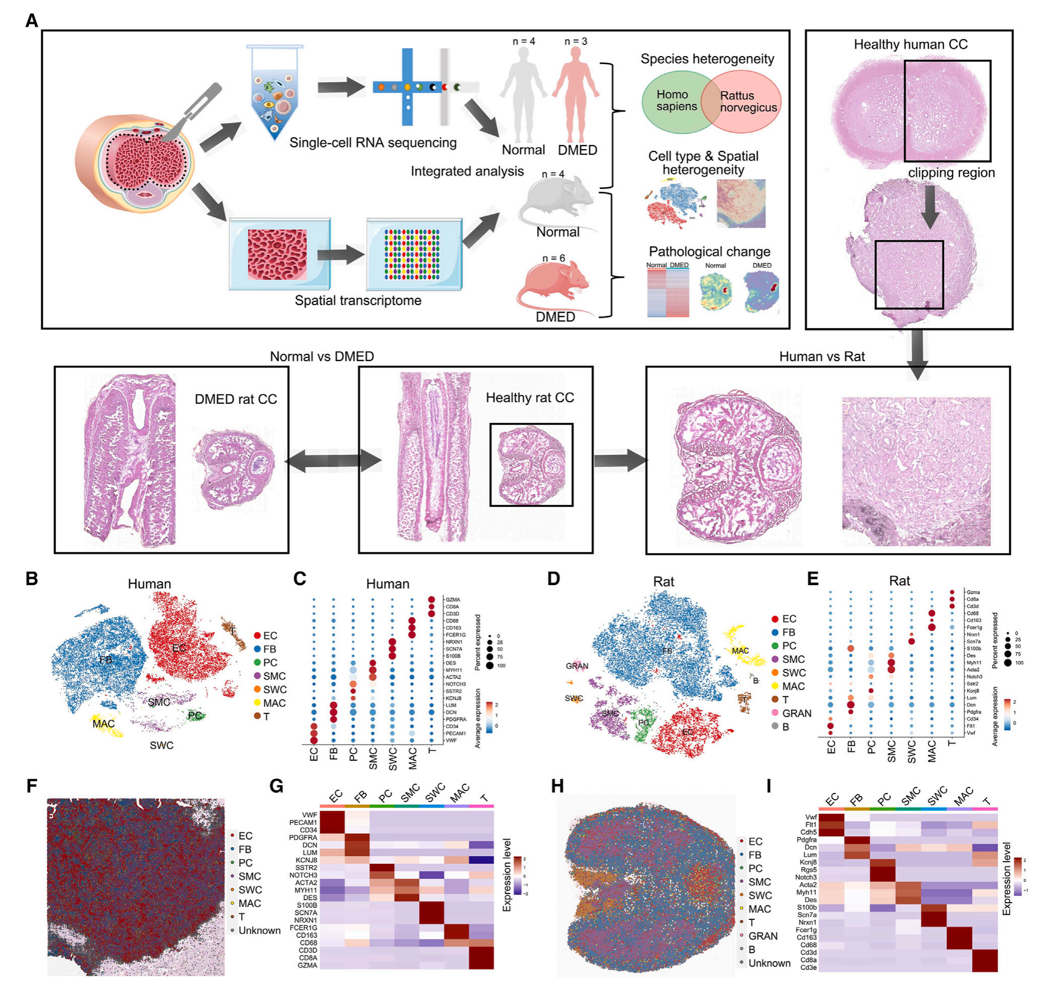 圖1-通過(guò)scRNA-seq和空間轉(zhuǎn)錄組技術(shù)得到的人類,以及正常/DMED條件下大鼠的CC細(xì)胞全局表達(dá)譜