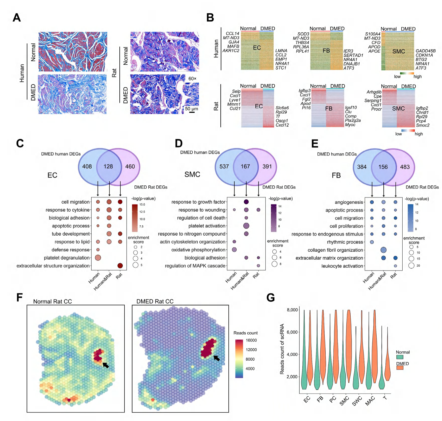為了更好的認(rèn)識(shí)DMED病理?xiàng)l件下,人類和大鼠CC微環(huán)境發(fā)生的變化是否與每種CC細(xì)胞類型中發(fā)生的分子水平變化相一致,研究者通過(guò)分析scRNA-seq數(shù)據(jù),發(fā)現(xiàn)DMED大鼠模型和DMED患者都經(jīng)歷了顯著的纖維化以及細(xì)胞組分丟失,但兩者間的轉(zhuǎn)錄組差異顯著。富集分析結(jié)果顯示,僅DMED大鼠模型富集了“extracellular structure organization”;“actin cytoskeleton or organization”和“oxidative phosphorylation”僅在人類DMED患者SMC中發(fā)現(xiàn),“regulation of MARK cascade”僅在DMED大鼠模型SMC中富集;“rhythmic process”僅在人類DMED患者FB中富集,“l(fā)eukocyte activation”僅在DMED大鼠模型FB中富集。