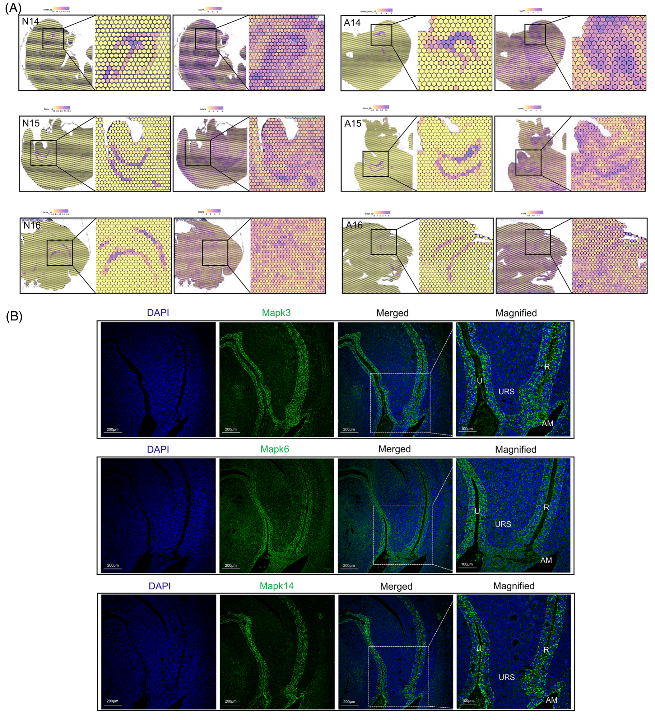 PROGENy 算法用于通過下游基因表達(dá)的變化評(píng)估信號(hào)通路的活性。作者獲得了正常組和 ARM 組 GDs 14-16 樣本中不同通路的活性水平評(píng)分。在使用 NNMF 對(duì)后腸區(qū)域(N14 因子 16、A14 因子 15、N15 因子 15、A15 因子 20、N16 因子 18 和 A16 因子 10)進(jìn)行聚類分析中,PROGENy 算法顯示與 MAPK 信號(hào)通路呈強(qiáng)正相關(guān),表明 MAPK 信號(hào)在后腸中顯著富集(圖 3A)。從這些區(qū)域提取來自 Erk、P38、JNK 和 Erk5 家族的 12 個(gè)成員分子的定位表達(dá)模式。具體來說,Mapk3 、 Mapk6 和 Mapk14 主要富集在泄殖腔區(qū)域。這些蛋白質(zhì)的免疫熒光驗(yàn)證證實(shí)了它們?cè)谀虻篮秃竽c區(qū)域的特異性表達(dá),在 URS 和間質(zhì)區(qū)域的表達(dá)相對(duì)較弱,這與 PROGENy 預(yù)測(cè)一致(圖 3B)。