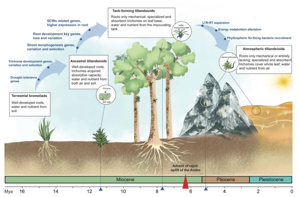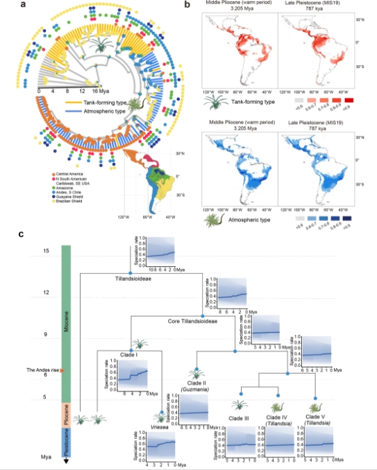 為了追溯空氣鳳梨的起源,研究人員廣泛收集了覆蓋空氣鳳梨亞科(Tillandsioideae)78%屬的植物,利用轉(zhuǎn)錄組測(cè)序獲得低拷貝基因的91個(gè)核基因,構(gòu)建了空氣鳳梨亞科植物系統(tǒng)發(fā)育樹(圖1)。然后通過祖先重建和分子鐘計(jì)算,發(fā)現(xiàn)核心空氣鳳梨亞科植物起源于11.3百萬年前的安第斯山脈,祖先類型為積水型鳳梨(圖2a)。大約在6百萬年前,安第斯山脈快速隆起,推動(dòng)了物種的分化,完全大氣生的空氣鳳梨出現(xiàn),這些植物通常被稱為“air plants”。地球氣候世代的轉(zhuǎn)變也加速了物種的分化(圖2b-c)。