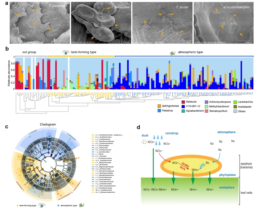 在解決了水分吸收問題后,另一個(gè)對(duì)空氣植物生存至關(guān)重要的問題是養(yǎng)分問題。研究人員通過16S rRNA測(cè)序和宏基因組分析,發(fā)現(xiàn)空氣鳳梨葉表附生了大量固氮細(xì)菌(圖7a),且這些細(xì)菌具有特異性,特別是1174-901-12屬細(xì)菌,專一性地附生在空氣鳳梨的葉表,并且在細(xì)菌類群中占據(jù)主要地位,可能與空氣鳳梨共進(jìn)化(圖7b-c)。此外,固氮酶nifA和nifH的發(fā)現(xiàn)進(jìn)一步證實(shí)了這些細(xì)菌的固氮能力(圖7d)。這些固氮細(xì)菌可能成為空氣植物的主要氮源,尤其在營(yíng)養(yǎng)匱乏的空中環(huán)境中尤為重要。