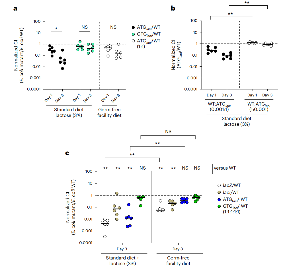 研究人員在不同的小鼠模型和飲食條件下,比較了 lacZ 突變體菌株的適應性。結果顯示,在不同條件下,lacZ 突變體菌株的適應性表現(xiàn)出差異,這表明 lacI GTG 起始密碼子的優(yōu)勢是上下依賴性的。例如,在無菌小鼠中,lacZ 突變體菌株的生長劣勢更加明顯,這表明腸道微生物群可能對 lacZYA 操縱子的活性產(chǎn)生影響。此外,不同飲食中乳糖含量的差異也可能影響 lacZ 突變體菌株的適應性。