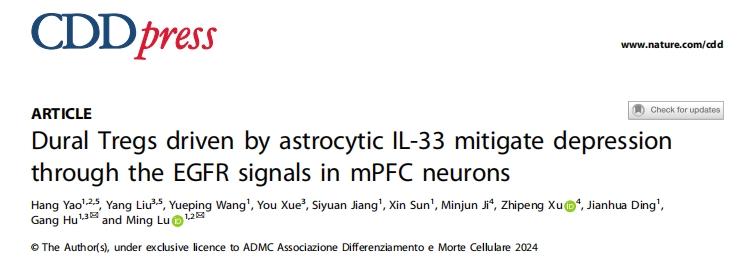 2024年11月,南京醫(yī)科大學(xué)基礎(chǔ)醫(yī)學(xué)院藥理學(xué)系魯明教授、胡剛教授團(tuán)隊在Cell Death & Differentiation發(fā)表題為”Dural Tregs Driven by Astrocytic IL-33 Mitigate Depression Through the EGFR Signals in mPFC Neurons”的研究論文,使用單細(xì)胞轉(zhuǎn)錄組測序技術(shù)等多種技術(shù),深入闡述小鼠硬腦膜免疫細(xì)胞的抗抑郁機(jī)制,為抑郁癥治療提供了新的潛在治療靶點(diǎn)。接下來是本文的詳細(xì)解讀。