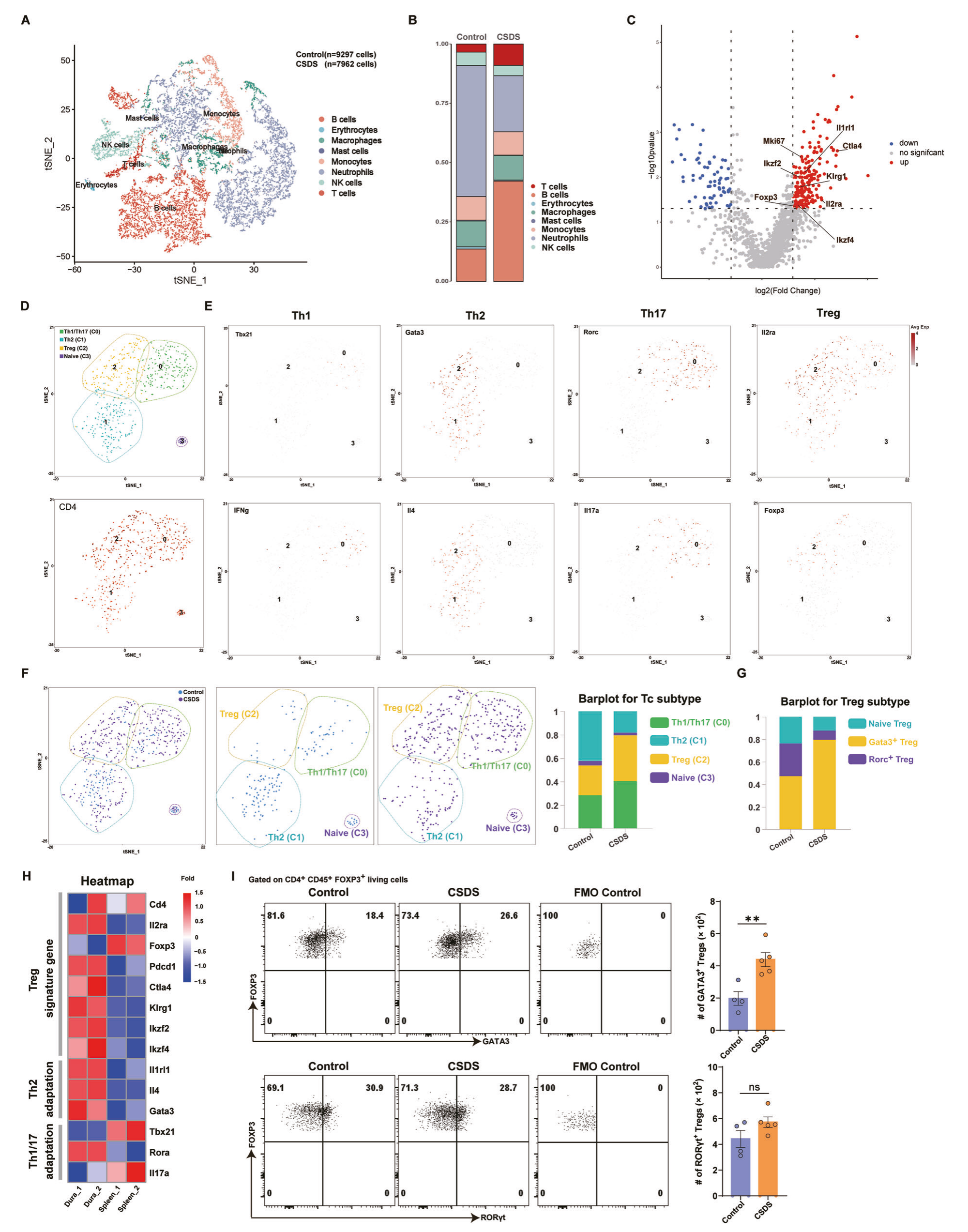 CSDS小鼠和對照組小鼠硬腦膜分選得到的免疫細(xì)胞進(jìn)行scRNA-seq,結(jié)果顯示CSDS小鼠硬腦膜T細(xì)胞占比增加,其中Treg和Th17比例增加,Th2比例降低,初始T細(xì)胞沒有發(fā)生變化;Treg中,Gata3+?Treg比例提高,初始Treg和Rorx+?Treg比例降低。對照組小鼠硬腦膜和脾臟分選得到Treg進(jìn)行SMART-seq,發(fā)現(xiàn)與脾臟相比,硬腦膜Treg的Gata3+亞型和Rora+亞型相關(guān)基因表達(dá)上調(diào)。流式細(xì)胞術(shù)進(jìn)一步證實(shí)CSDS小鼠硬腦膜中GATA3+?Treg顯著增加,RORγt+?Treg數(shù)量無顯著變化。這些表明GATA3+ Treg可能參與抑郁表現(xiàn)的調(diào)控。